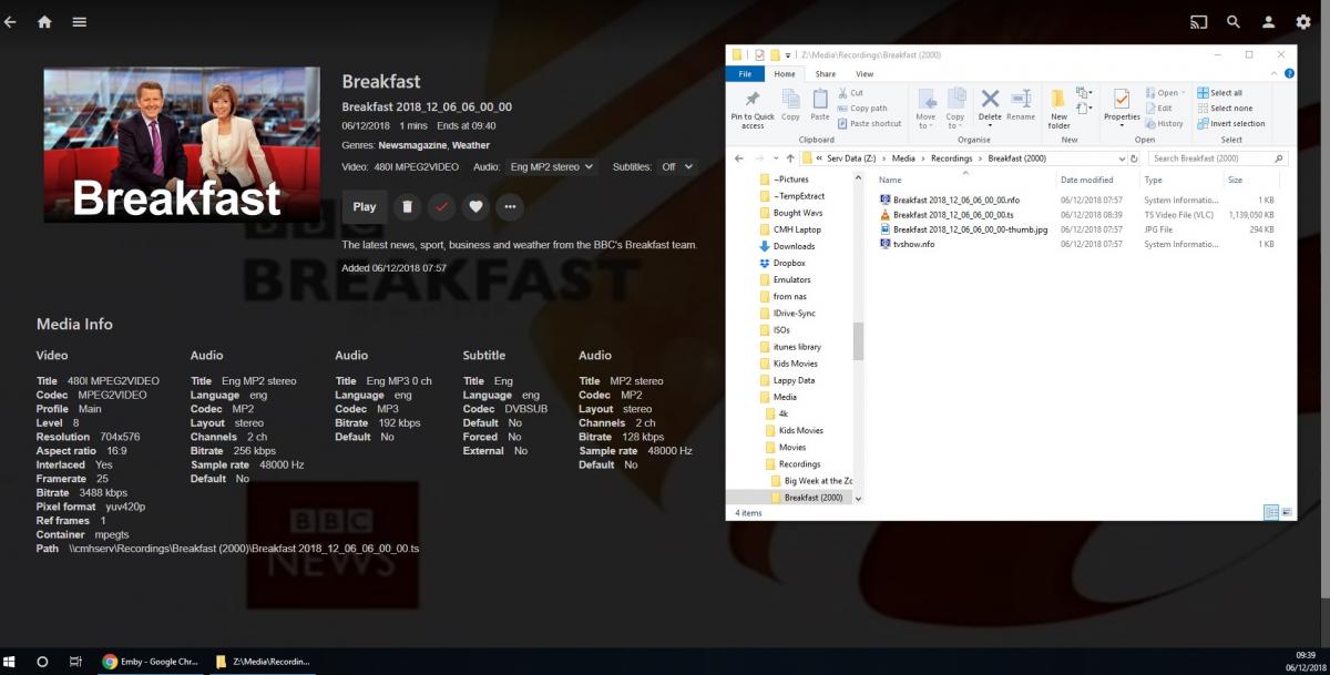 Spotta 6 Posted December 6, 2018 Author Posted December 6, 2018 I thought Luke's reply was to me! so have spent the morning getting more details I started recording BBC Breakfast this morning at 7:57 as as test, it's currently 8:29 and when I try to watch the recording it tells me it's only 1m 7 seconds long. Here is a screenshot taken at 8:32 showing the recording in Emby as 1 minute long, and also showing the folder it's being recorded to which shows the file creation time as 7:57, the size of the file, which is right for a 30 minute recording and also the current time as 8:32. attached: emby-1.jpg Here is a screenshot showing me watching the recording at 8:37 when it should be 40 minutes long, as you can see I can only watch 1 minute 7 seconds of it before it ends. attached: emby-2.jpg I stopped recording at 8:39 Here is a screenshot taken at 8:40 with the length still showing as 1 min. attached: emby-3.jpg I am refreshing the page every 5 minutes. here is a screenshot of it at 8:57 with the recording still showing as 1 min long, and also showing the actual recording on disk. attached: emby-4.jpg Now at 9:10 - still 1 min long, now refreshing every 15 minutes as I've got stuff to do! attached: emby-5.jpg Screenshot from my phone at 9:20 to show it affects all devices. attached: emby-6.png Now we're at 1 hour after the program finished recording - still shows as 1 min long, when played I can watch 1m7s only. attached: emby-7.jpg 10:57 - same. decided to restart the emby service on server - still same. 11:00 - Rebooted the server. time of recorded clip still shown as 1min. I can watch the first 1m7s of it. attached:v emby-8.jpg Here we are at 12:05 still the same attached: emby-9.jpg Normally we record/watch programs in the late evening. they are normally watchable and showing the correct length by the next evening so I have no idea how long this takes to right itself. I'll keep checking and once it shows up correctly I'll make a new post and include all logs