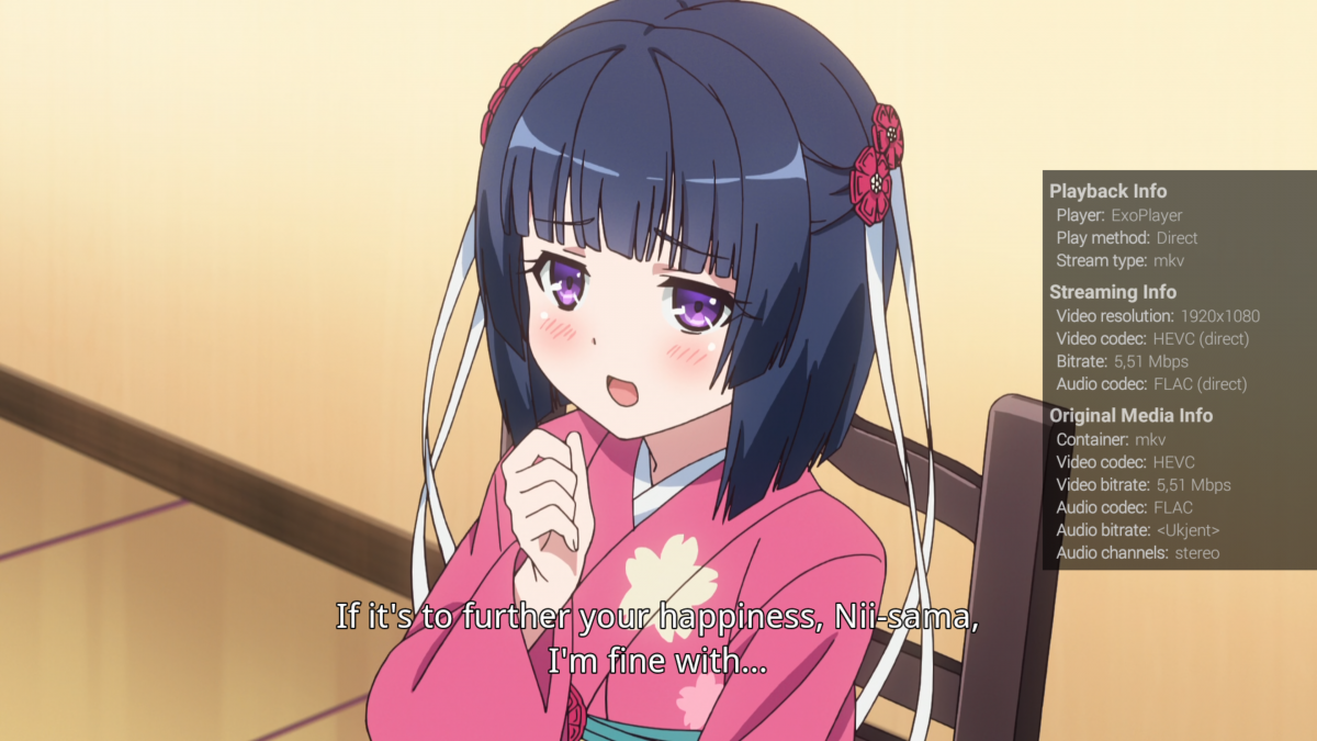 Gigaa 0 Posted December 4, 2018 Posted December 4, 2018 (edited) Hey. I recently bought an Nvidia shield tv and installed Emby Android TV, so far so good. However when playing video files with 24 bit sample flac files only loud static noise seems to be playing. Tested two files and both have been doing the exact same thing. Checking out the "stats for nerds" option shows them with "Audio bitrate: <Unknown>" but it plays perfectly on Emby with my phone or with mpv on my desktop. Here is the mediainfo for both of the files. [gigaa@gigaa-pc OVA]$ mediainfo \[animeisdead\]\ Nekopara\ -\ OVA\ \[BD\ 1080p\ h265\ 10-bit\ FLAC\].mkv General Unique ID : 244810833780211152170142419127130557648 (0xB82CD9FF19AC8022BE03EBC7343E8CD0) Complete name : [animeisdead] Nekopara - OVA [BD 1080p h265 10-bit FLAC].mkv Format : Matroska Format version : Version 4 File size : 2.24 GiB Duration : 58 min 6 s Overall bit rate mode : Variable Overall bit rate : 5 510 kb/s Encoded date : UTC 2018-02-05 10:24:15 / UTC 2018-02-05T02:14:02Z Writing application : mkvmerge v20.0.0 ('I Am The Sun') 64-bit Writing library : libebml v1.3.5 + libmatroska v1.4.8 / Lavf57.7.2 Attachments : FontinSans-Bold.ttf / FontinSans-BoldItalic.ttf Video ID : 1 Format : HEVC Format/Info : High Efficiency Video Coding Format profile : Main 10@L4@Main Codec ID : V_MPEGH/ISO/HEVC Duration : 58 min 6 s Bit rate : 3 966 kb/s Width : 1 920 pixels Height : 1 080 pixels Display aspect ratio : 16:9 Frame rate mode : Constant Frame rate : 23.976 (24000/1001) FPS Color space : YUV Chroma subsampling : 4:2:0 Bit depth : 10 bits Bits/(Pixel*Frame) : 0.080 Stream size : 1.61 GiB (72%) Title : h265 10-bit Writing library : x265 2.6:[Linux][GCC 7.2.1][64 bit] 10bit Encoding settings : cpuid=1173503 / frame-threads=2 / wpp / no-pmode / no-pme / no-psnr / no-ssim / log-level=2 / input-csp=1 / input-res=1920x1080 / interlace=0 / total-frames=0 / level-idc=0 / high-tier=1 / uhd-bd=0 / ref=3 / no-allow-non-conformance / no-repeat-headers / annexb / no-aud / no-hrd / info / hash=0 / no-temporal-layers / open-gop / min-keyint=24 / keyint=240 / bframes=4 / b-adapt=2 / b-pyramid / bframe-bias=0 / rc-lookahead=20 / lookahead-slices=6 / scenecut=40 / no-intra-refresh / ctu=64 / min-cu-size=8 / no-rect / no-amp / max-tu-size=32 / tu-inter-depth=1 / tu-intra-depth=1 / limit-tu=0 / rdoq-level=0 / dynamic-rd=0.00 / no-ssim-rd / signhide / no-tskip / nr-intra=0 / nr-inter=0 / no-constrained-intra / strong-intra-smoothing / max-merge=2 / limit-refs=3 / no-limit-modes / me=1 / subme=2 / merange=57 / temporal-mvp / weightp / no-weightb / no-analyze-src-pics / deblock=0:0 / sao / no-sao-non-deblock / rd=3 / no-early-skip / rskip / no-fast-intra / no-tskip-fast / no-cu-lossless / no-b-intra / no-splitrd-skip / rdpenalty=0 / psy-rd=2.00 / psy-rdoq=0.00 / no-rd-refine / analysis-reuse-mode=0 / no-lossless / cbqpoffs=0 / crqpoffs=0 / rc=crf / crf=16.0 / qcomp=0.60 / qpstep=4 / stats-write=0 / stats-read=0 / ipratio=1.40 / pbratio=1.30 / aq-mode=1 / aq-strength=1.00 / cutree / zone-count=0 / no-strict-cbr / qg-size=32 / no-rc-grain / qpmax=69 / qpmin=0 / no-const-vbv / sar=1 / overscan=0 / videoformat=5 / range=0 / colorprim=1 / transfer=1 / colormatrix=1 / chromaloc=0 / display-window=0 / max-cll=0,0 / min-luma=0 / max-luma=1023 / log2-max-poc-lsb=8 / vui-timing-info / vui-hrd-info / slices=1 / no-opt-qp-pps / no-opt-ref-list-length-pps / no-multi-pass-opt-rps / scenecut-bias=0.05 / no-opt-cu-delta-qp / no-aq-motion / no-hdr / no-hdr-opt / no-dhdr10-opt / analysis-reuse-level=5 / scale-factor=0 / refine-intra=0 / refine-inter=0 / refine-mv=0 / no-limit-sao / ctu-info=0 / no-lowpass-dct / refine-mv-type=0 / copy-pic=1 Language : Japanese Default : Yes Forced : No Color range : Limited Color primaries : BT.709 Transfer characteristics : BT.709 Matrix coefficients : BT.709 Audio ID : 2 Format : FLAC Format/Info : Free Lossless Audio Codec Codec ID : A_FLAC Duration : 58 min 6 s Bit rate mode : Variable Bit rate : 1 424 kb/s Channel(s) : 2 channels Channel layout : L R Sampling rate : 48.0 kHz Frame rate : 10.417 FPS (4608 SPF) Bit depth : 24 bits Compression mode : Lossless Stream size : 592 MiB (26%) Title : FLAC 2.0 Language : Japanese Default : Yes Forced : No Text #1 ID : 3 Format : ASS Codec ID : S_TEXT/ASS Codec ID/Info : Advanced Sub Station Alpha Duration : 54 min 1 s Bit rate : 128 b/s Count of elements : 817 Compression mode : Lossless Stream size : 50.9 KiB (0%) Title : English Language : English Default : Yes Forced : No Text #2 ID : 4 Format : PGS Muxing mode : zlib Codec ID : S_HDMV/PGS Codec ID/Info : Picture based subtitle format used on BDs/HD-DVDs Duration : 54 min 0 s Bit rate : 310 kb/s Count of elements : 5611 Stream size : 120 MiB (5%) Title : Japanese Language : Japanese Default : No Forced : No Menu 00:00:00.000 : :Prologue 00:00:34.076 : :OP 00:02:04.166 : :Part A 00:21:34.293 : :Part B 00:39:28.658 : :Part C 00:52:25.643 : :Part D 00:54:14.293 : :ED [gigaa@gigaa-pc Season 1]$ mediainfo \[UTW\]_Angel_Beats\!_-_01v2_\[BD\]\[h264-1080p_FLAC\]\[B448458F\].mkv General Unique ID : 239893702643211187375890717938566201277 (0xB479D8B6C8794DE091B782F6B0AA7FBD) Complete name : [UTW]_Angel_Beats!_-_01v2_[BD][h264-1080p_FLAC][B448458F].mkv Format : Matroska Format version : Version 2 File size : 1.13 GiB Duration : 26 min 1 s Overall bit rate mode : Variable Overall bit rate : 6 191 kb/s Movie name : Angel Beats! BD - Episode 01: Departure Encoded date : UTC 2011-02-28 10:17:34 Writing application : mkvmerge v3.4.0 ('Rapunzel') built on May 15 2010 09:38:20 Writing library : libebml v0.8.0 + libmatroska v0.9.0 Attachments : Adore.ttf / Angelina.TTF / AriaScriptSSK-Regular.ttf / BAKESBR_.TTF / BrittanicBold.TTF / ChopinScript.TTF / CopperplateGothicBold.TTF / EFFLORES.TTF / Michv2.ttf / TakaoPMincho.ttf / VAGRoundedStd-Light.ttf Video ID : 1 Format : AVC Format/Info : Advanced Video Codec Format profile : High@L4.1 Format settings : CABAC / 3 Ref Frames Format settings,