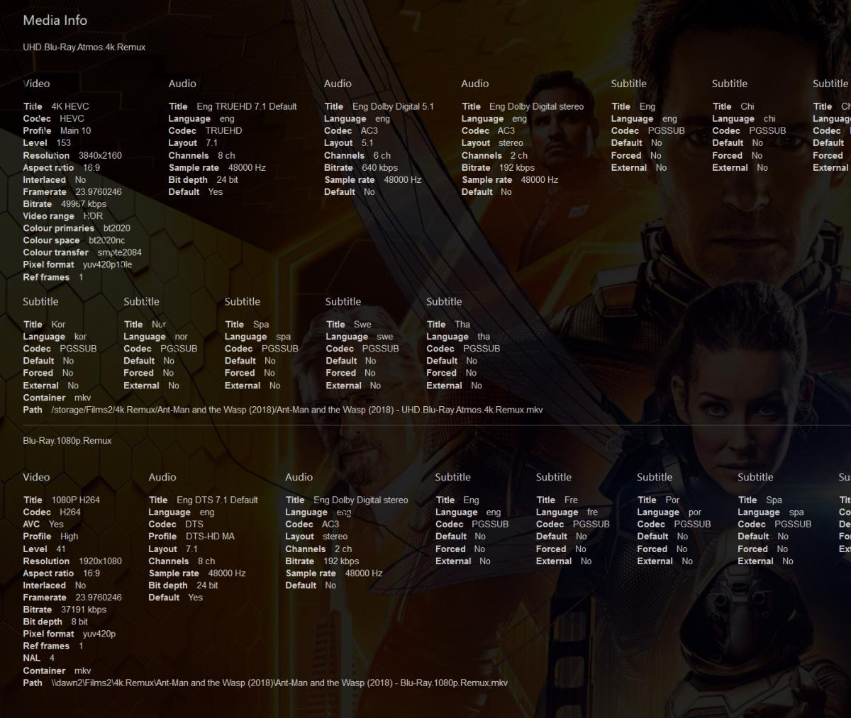 Mevlock 1 Posted January 4, 2019 Posted January 4, 2019 I've just noticed a problem I'm having with multi-versions. For example: Ant-Man and the Wasp (2018) Ant-Man and the Wasp (2018) - Blu-Ray.1080p.Remux.mkv Ant-Man and the Wasp (2018) - UHD.Blu-Ray.Atmos.4k.Remux.mkv If I have folders setup like above only one version will play properly with path substitution directly from my network share. If you look at the second screenshot below you'll see that only one of the versions is showing the correct substituted path. It's like this for every movie that has multiple versions, only one will utilise path substitution. I have the same problem with both the current stable and beta releases. Perhaps I've misconfigured something but I've tried setting everything up from scratch with the same result. Currently using the linux version of emby via docker.