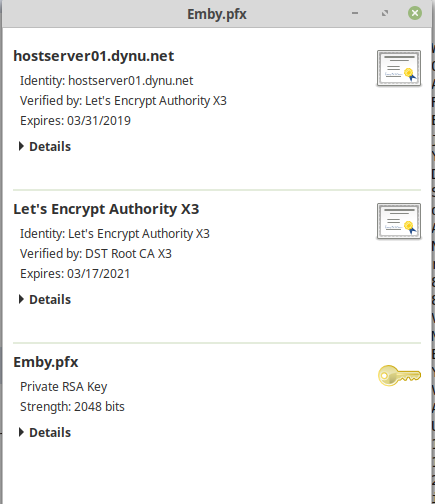 Q-Droid 989 Posted January 7, 2019 Posted January 7, 2019 I can see both certs after running the command. Result below openssl pkcs12 -info -in /opt/emby/ssl/emby.pfx -nokeys | grep -i subject Enter Import Password: MAC: sha1, Iteration 2048 MAC length: 20, salt length: 8 PKCS7 Encrypted data: pbeWithSHA1And40BitRC2-CBC, Iteration 2048 Certificate bag Certificate bag PKCS7 Data Shrouded Keybag: pbeWithSHA1And3-KeyTripleDES-CBC, Iteration 2048 subject=CN = [subdomain].dynu.net subject=C = US, O = Let's Encrypt, CN = Let's Encrypt Authority X3 Also, I tried the command you provided to export the pem files to pfx, add the pfx in emby server then restart. Same thing. I'm stumped. Have you considered renewing the cert to work with a new set? It's easier to do that first than try all the troubleshooting steps I would go thru.