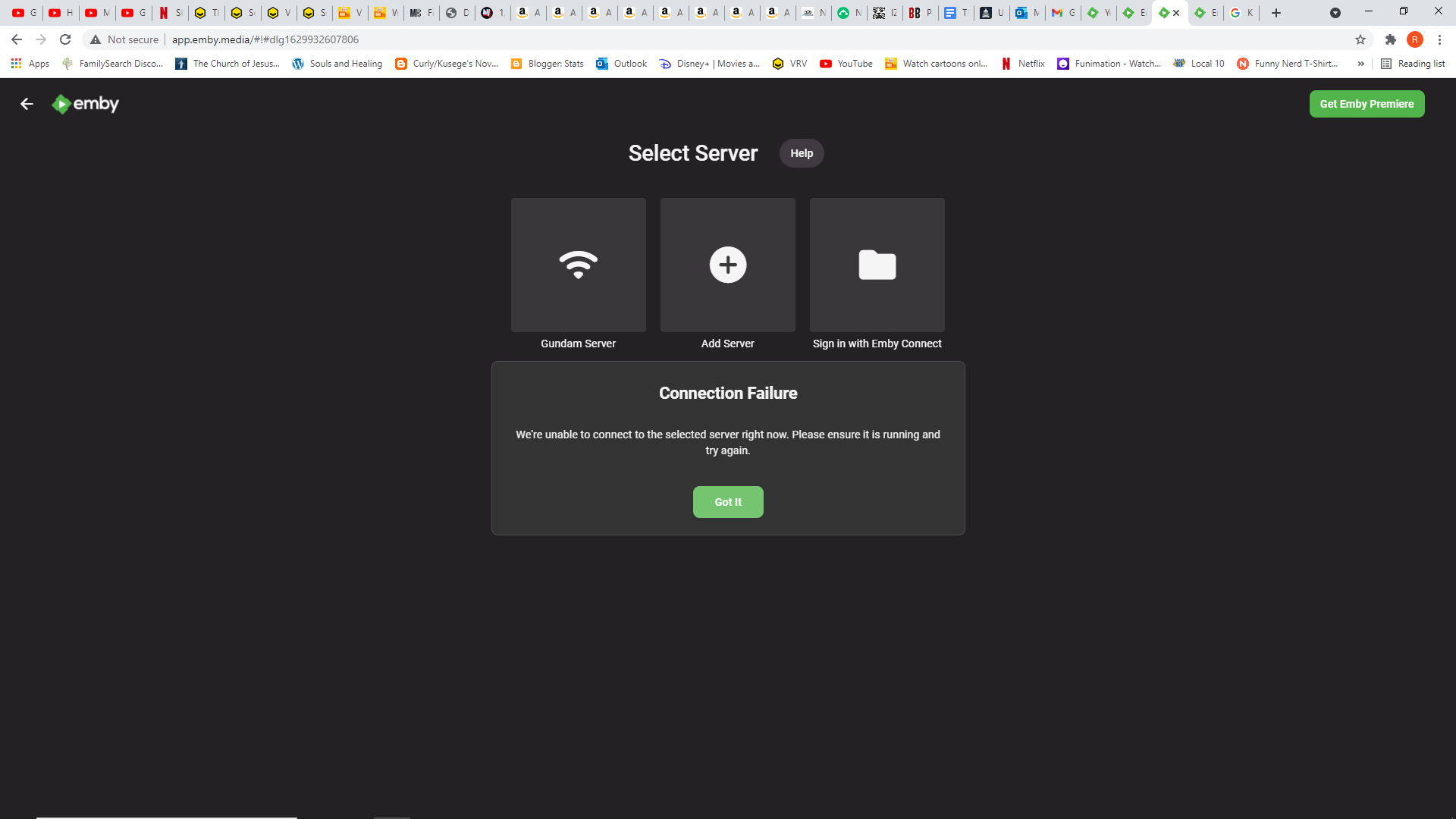 giricns72 1 Posted October 8, 2020 Posted October 8, 2020 Hello Luke, I know this an old thread, but I am having the same issue and it's only recent. I can connect with my phone, my tablet and my XBOX ONE, but not my desktop PC. It used to connect just fine, then one day I started getting the "We're unable to connect to the selected server right now. Please ensure it's running and try again." error message and have not been able to connect since. I run the server on a newer laptop which my desktop can access through the home network to read/write files from and to with no issues. It simply cannot access the Emby server and it is driving me crazy trying to figure out why. Any ideas? Any help would be greatly appreciated. Thanks! James