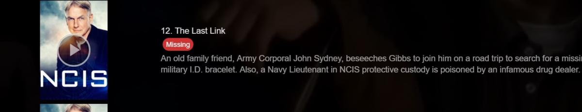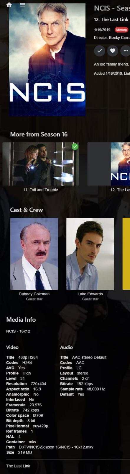 legallink 187 Posted January 18, 2019 Author Posted January 18, 2019 (edited) A full library scan does resolve this, but historically that hasn't been necessary. I have "active monitoring" checked for the respective library. I didn't check on meta refresh, I can try that next time. I don't think it's a different cached id, as it shows correctly in one place, indicates that it has the media, but the two displays don't link for some reason. If you look at the photos, it says "Missing" at the top, but then populates the correct media info (including the correct file). Which would by necessity mean that it isn't missing but for some reason the detail areas are not drawing information from the same place, or one is taking a lot (meaning hours) longer to populate than the other. The three pictures I provided are: 1. The episode screen (note it says missing up top, but shows media info below) 2. Next Up (which only populates when it finds the file and displays it for the next up to watch) 3. The Season episode list (which shows the file as missing) All the screen shots were taken a couple hours after uploading the file, within 90 seconds of each other. -------However this might have been a day 1 of the new server build issue. Let's not worry about it til day 5. It seems today things are responding quite quickly....so consider the problem solved til I bring it up again. Edited January 18, 2019 by legallink
