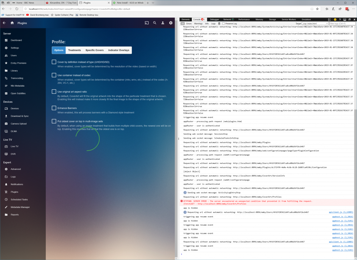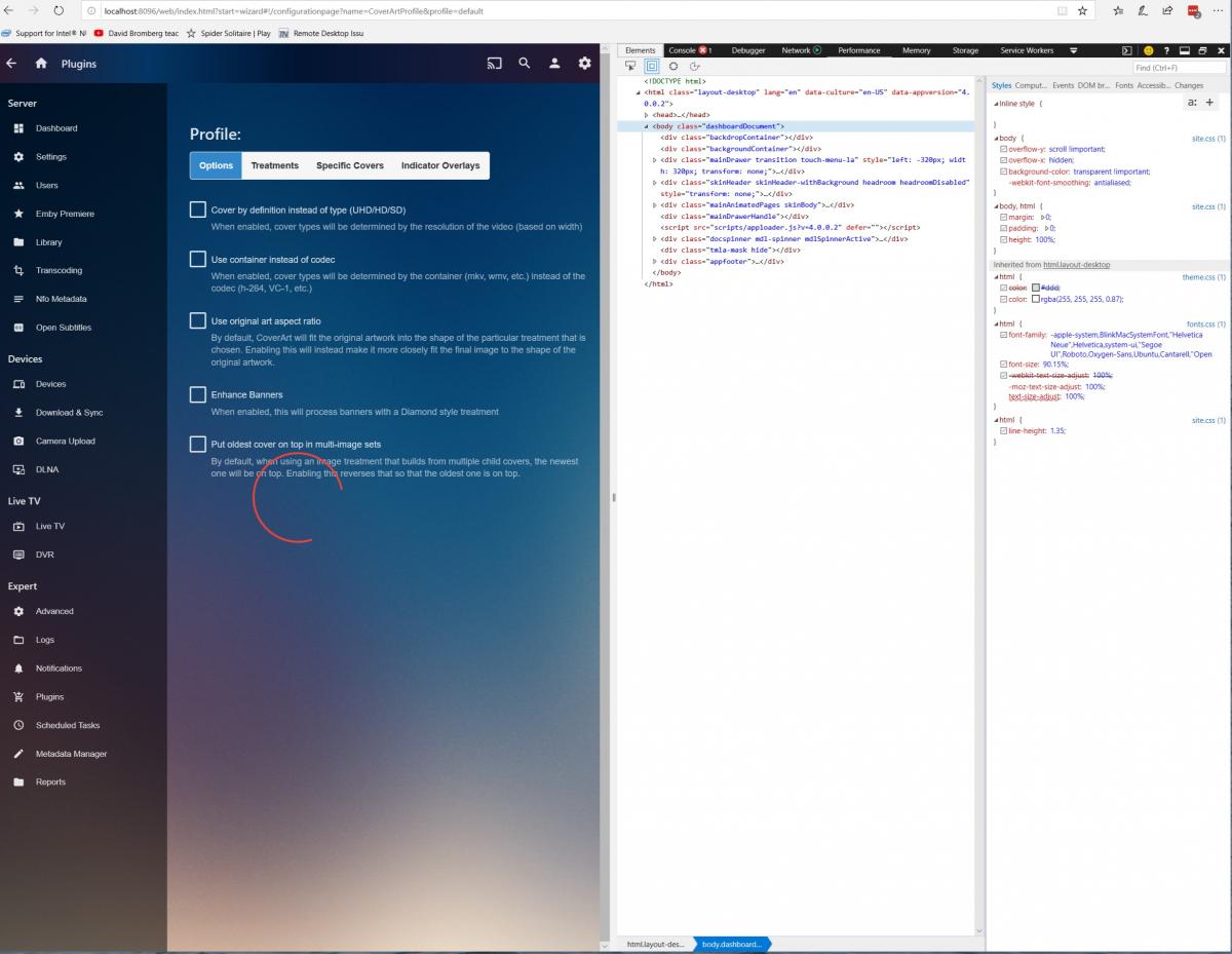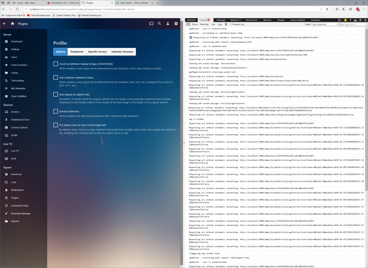 Happy2Play 9782 Posted January 17, 2019 Posted January 17, 2019 Should have said, but I have an almost identical configuration running beta server 4.0.0.2. Same version of CoverArt works just fine there, same release of Windows 10. Also, if you need it, I'll install Chrome. What I'm seeing is the ConfigureEmby management screen in Windows Edge Is the version of the plugin the same running on both servers? Can you post a server log also.