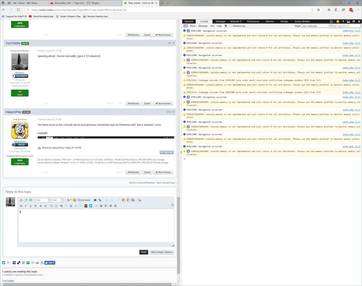TomTiddler 39 Posted January 16, 2019 Author Posted January 16, 2019 Should have said, but I have an almost identical configuration running beta server 4.0.0.2. Same version of CoverArt works just fine there, same release of Windows 10. Also, if you need it, I'll install Chrome. What I'm seeing is the ConfigureEmby management screen in Windows Edge