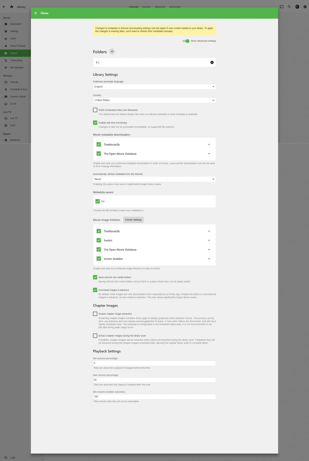 bernardotraad 0 Posted January 25, 2019 Posted January 25, 2019 Hello, I'm using Emby Server v4.0.1.0 on Windows 10 x64, and after the last update I've added a new movie to my library: Bohemian Rhapsody (2018) The folder structure is: F:\Bohemian Rhapsody (2018) [1080p]\ And the files are: Bohemian Rhapsody (2018).mp4 Bohemian Rhapsody (2018).srt All my movies on the library are like the example above, and it always worked fine. But this movie is not detected and the nfo and image files are not downloaded. My settings for the library are in the screenshot. If you need more info, please let me know. Thanks