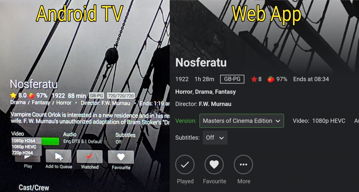 hoverdose 3 Posted January 27, 2019 Author Posted January 27, 2019 (edited) Hi. The labeling is different than it was before the update to the app? It very much is. I have named a huge portion of my library in one of the two ways that Emby recognises, for example: Night of the Living Dead (1968) - 1080p Colourised Edition.mkv Night of the Living Dead (1968) [1080p B&W Edition].mkv Both of which yielded a drop down menu item with the info either after the hyphen or in the square brackets (and indeed this is still the case on the Android app). After the Android TV update it is simply Resolution and Codec with no clue as to which version it is anywhere Edited January 27, 2019 by hoverdose
