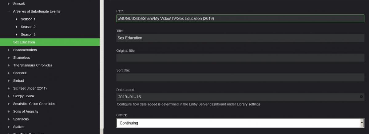 Mogub 1 Posted January 28, 2019 Posted January 28, 2019 Hi I got some missing seasons and episodes in some new Tv Show I add after 4.0.0.2. Even after the update to 4.0.1.0, the scan can't find them.Got some error in the log like this : 2019-01-28 09:22:54.577 Error BaseItem: Found folder containing items with duplicate id. Path: \\MOGUBSBS\Share\My Video\TV\Sex Education (2019)\Season 1, Child Name: Episode 2 2019-01-28 09:22:54.577 Error BaseItem: Found folder containing items with duplicate id. Path: \\MOGUBSBS\Share\My Video\TV\Sex Education (2019)\Season 1, Child Name: Episode 3... ... ... In Emby for WMC, got no items for those Tv Show. In attachment : Log File, Metadata View, Folder View and Library View (missing episodes in "TV Serie") Thanks Log