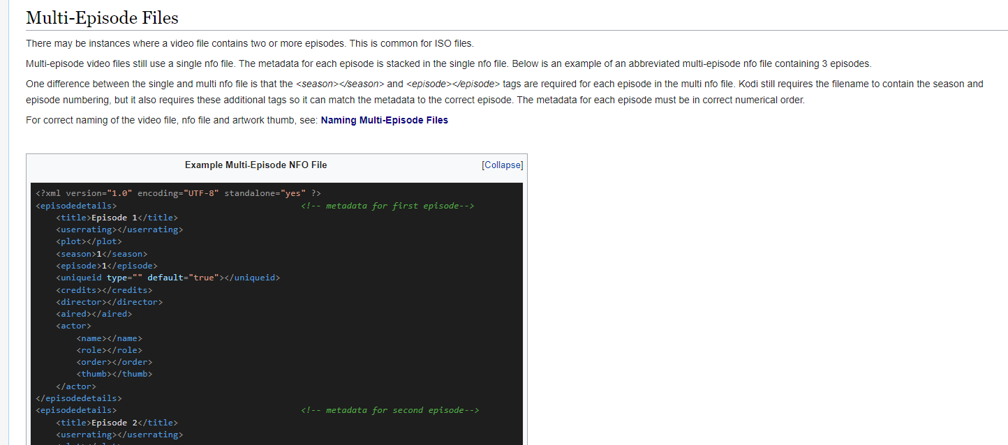 Luke 42078 Posted March 4, 2024 Posted March 4, 2024 6 minutes ago, Happy2Play said: Looks like @worthmoit in discussion over there. Keep us updated on there reply. Media Companion / Discussion / Requests Declined: Multiple TV Episodes Format for Emby (sourceforge.net) But has anyone heard of Kodi using <multiepisodenfo>? Searching the kodi codebase yields no results and also found this: https://github.com/xbmc/xbmc/issues/16506 Granted, it's always possible that it's supported in kodi but the code is somewhere else for it.