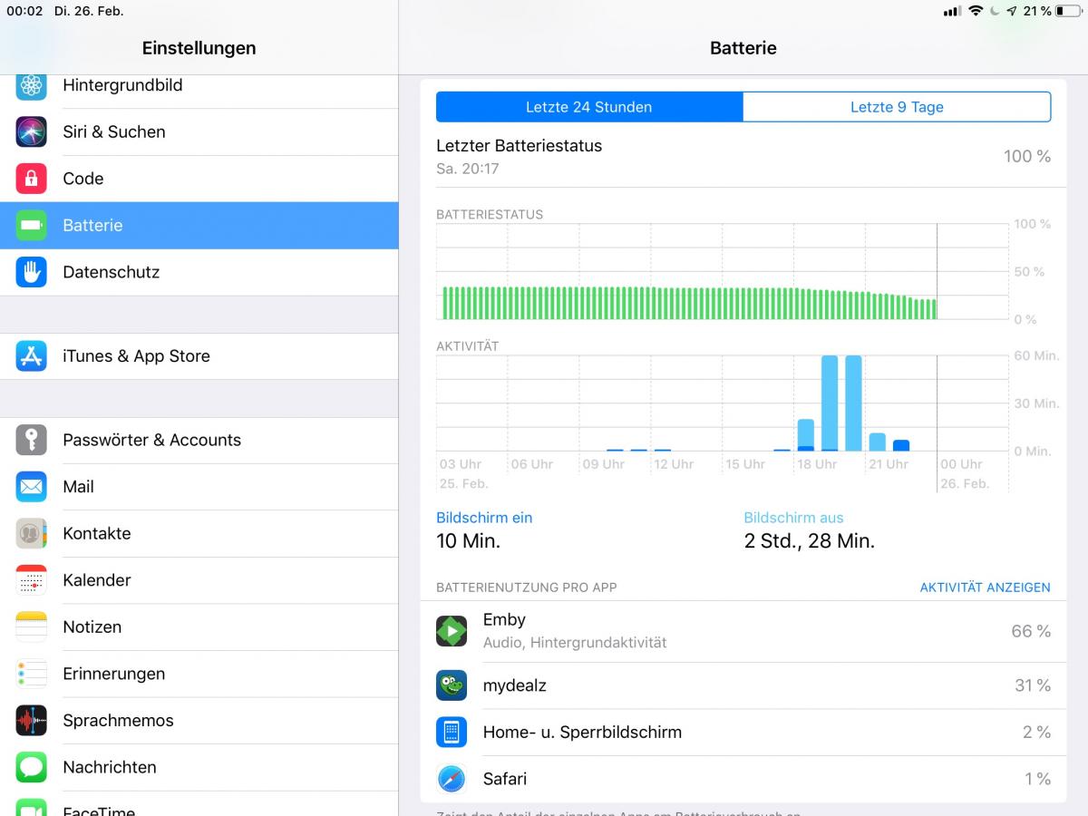 lejared 29 Posted February 26, 2019 Posted February 26, 2019 (edited) The Emby app consumes a lot of battery power when running in the background while playing a movie over DLNA on my TV. Since I've got a Samsung 2017 Tizen TV in Europe and there is no native app, I use my iPad Air to browse my libraries and then show the movies on the TV via DLNA, which btw works quite comfortably! When I've done so I just turn off the iPad and put it away. Right after the movies was over i noticed that the battery dropped from almost 100% some 40% down to 21% in just 2,5 hours. Please see the screenshot of the iPad attached. The iPad was turned off (standby) all the time while I watched the movie. Technical Info: iPad Air (1st Generation), iOS 12.1.4, Emby App 1.7.4 Emby Server 4.0.2.0 on Windows 7 64 Bit Samsung TV MU8009 Edit: As I notice just now on my own screenshot the iPad was obviously not fully charged when I started the movie. I'll watch an try this again with a fully charged iPad and no other apps running in the Background in the next days. Edited February 26, 2019 by lejared