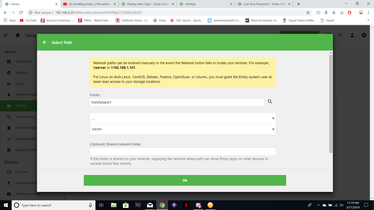 Minipops 0 Posted March 18, 2019 Posted March 18, 2019 (edited) Hello everyone, I'm having an issue with finding my media folder with emby. Its hard to describe where and how i got to this area of issue so the best way i can explain it is by showing the steps i took to get setup to the stage where you point emby to your shared folders. So i recently built a NAS. I has 1 mirrored raid1 setup. and its OS is Open Media Vault 4. I followed this video to the letter when i installed it After that, i followed the instructions exactly in this video describing how to install and setup Emby in Open Media Vault So when it comes time to add Media Library, i click it. Content type: i select Movies Click folders: select /mnt/share1 Now in the instructional video his result says Movies. Mine says cdrom. There is no cdrom anywhere because the server does not have one. What the heck? Edit: Docker info picture has been added. Edited March 18, 2019 by Minipops