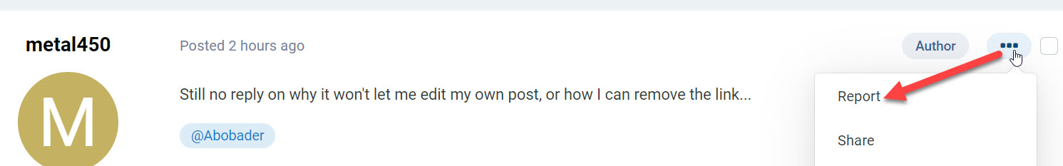 tiorsus 4 Posted November 16, 2021 Author Posted November 16, 2021 On 11/6/2021 at 3:17 AM, Luke said: @metal450 can you please copy the contents of your report into this thread, just so that we can keep the discussion in one place rather than two? Thanks . Same thing as I posted here over a month ago (on Oct 9th, above). I tried here first, no action took place, so I was told on October 21st to instead post a report, which I did. Now I'm being told to post it here rather than in the report (which is what I did originally). Really not able to understand why so much run-around is necessary just to simply edit a post...but...looks like it's finally been changed (even though I still cannot edit my own posts). Thanks. @Abobader