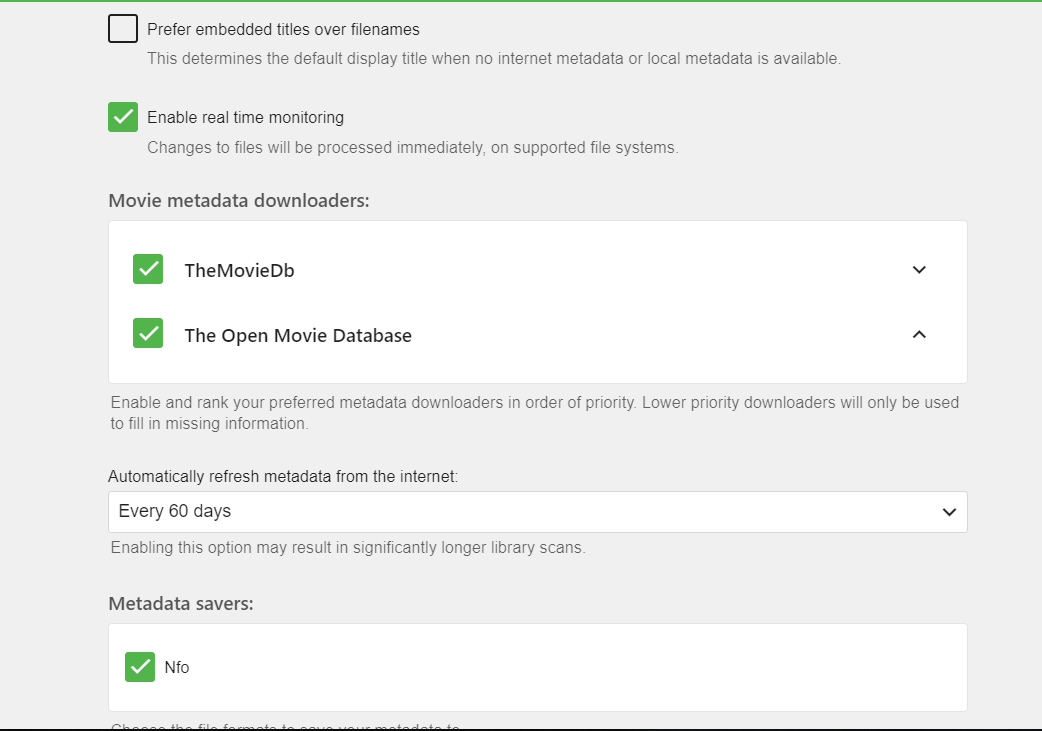 EvilChani 0 Posted May 4, 2019 Author Posted May 4, 2019 I've attached a screenshot of how the movies show up in the library from the web interface (and from my Roku Emby app). At best, I get a colored background with the movie name, but the metadata is still not downloaded. I attached another with the settings for the library. The naming convention I use is "Movie Name (year).mp4" and is the same naming convention I used for Plex, so I didn't think that could be a problem, given that it had been downloading the metadata without any problem. Let me know if you need more info from the library and/or server. Thanks!