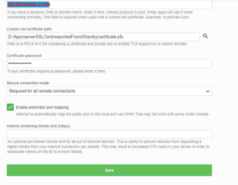 dragonkeyper 1 Posted May 6, 2019 Posted May 6, 2019 Using my domain name I am able to I'm able to connect via a standard HTTP connection and but I can make a secure connection to the server using my ip address but I am unable to connect via HTTPS using my domain name. Server logs attached and screen caps of current settings. embyserver.txt Here is a view of my current sever urls: My Emby Server settings: My Dynu redirect settings: My Router settings: Any insight into what I've mis-configured would be greatly appreciated. Thans