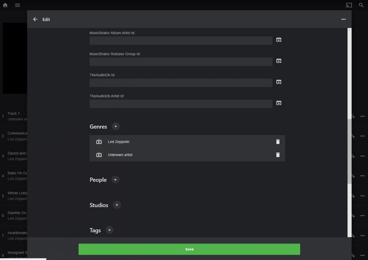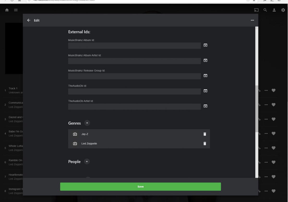 jachin99 88 Posted July 29, 2019 Author Posted July 29, 2019 (edited) I opened the Emby Web app as the administrative user who has permissions to manage the library and make changes. I selected the artist sort under music, then selected one of the unknown albums listed under unknown artist. This one happened to be a Led Zepplin album. In the Before genre edit screenshot below you can see Jay-Z is not listed, and I think it says something like Led Zepplin, and unknown Artist. So I pressed the more button chose to edit the metadata to remove all genres. Afterwards I hit save. I then hit the more button again to check the genres, and in the screenshot called after genre edit you can see led zeppelin, and JayZ listed as the genre, and the backdrop on the album's web page shows JayZ fanart. I hope that is more descriptive, and I can provide more info if need be. Thanks. Edited July 29, 2019 by jachin99 1