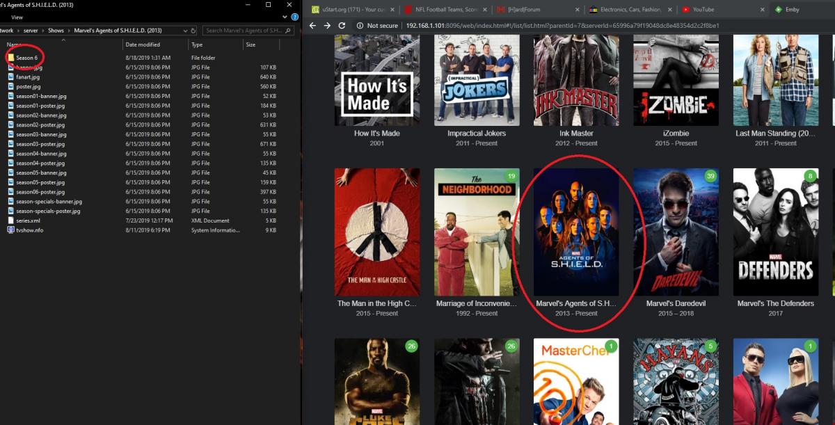 rigo8582 16 Posted August 23, 2019 Author Posted August 23, 2019 (edited) Looks like expected behavior. You have no content inside your agents of shield folder. Did that change recently? In the past Shows used to still populate with the metadata with just the folder in the library. It used to still identify as a series and would put new episodes in with auto organize. When I made this suggestion https://emby.media/community/index.php?/topic/67447-delete-the-season-folder-when-deleting-the-last-episode/?hl=%2Bseason+%2Bfolder back in January it wasn't operating this way. Edited August 23, 2019 by rigo8582