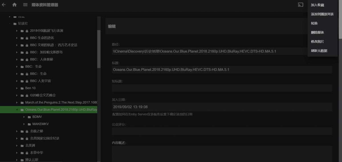 moneycwq 2 Posted September 7, 2019 Author Posted September 7, 2019 You will probably have to post a server log so we can see the search queries you are doing. IMDB is not a metadata option anywhere in Emby. Going off the image you posted above what do you see when you expand BDMV folder? I assume you see the file as you can not apply or search for metadata on the folder you have highlighted in that image as that is only a folder. If I put this Blu-ray folder into the movie media library, I can recognize that it can be played, and in the documentary media library (mixed structure) is a folder. This option does not appear to be recognized. On the one hand, the documentary media library does not recognize the BDMV film. On the other hand, it does not allow me to manually edit and identify. In addition, there are some documentaries that cannot be recognized by hand editing anyway. I really don't know what to do. I will collect the logs and put them up.