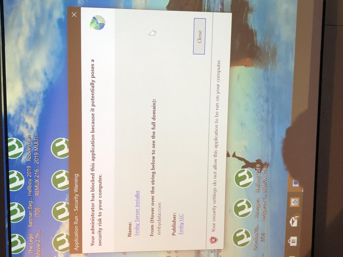 pwhodges 2012 Posted September 6, 2019 Posted September 6, 2019 That security warning would appear to be UAC, but your screenshot does not show the option to bypass it. I guess you could try option 2 here to get Emby installed. https://windowsreport.com/open-file-security-warning/ Or grab the portable and unzip it to a location of your choice. https://emby.media/windows-server.html Also worth trying doing a right click on the installer and selecting "Run as Administrator" - which enables more rights than merely being logged in as an administrator.