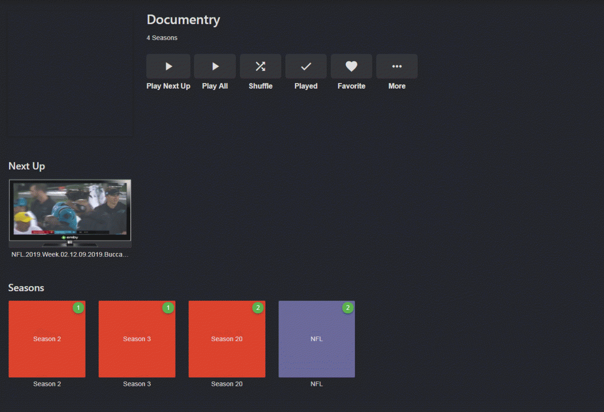 shpitz461 4 Posted September 19, 2019 Posted September 19, 2019 (edited) Hi, Not sure if this was asked in the past, but can i set up a single folder in which I put various single videos and they will all appear under that folder in my TV section? For example I put in the folder the following content: Documentries NFL recordings etc... Right now it catalogs each video file as a season, so i need to drill down in order to see the video itself, also I need to guess what each season contains... Would be great if I can create a subfolder in TV>Documentries such as Sports, Documentry, and have the video files listed under them as single direct-play files instead of seasons. In the attached image I do have an NFL folder but some NFL games for some reason some of the video files are listed under Season 20 and not NFL. Is there a trick I can use in naming the files in order to achieve desired result? Thanks! Edited September 20, 2019 by shpitz461