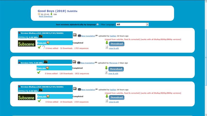 d00zah 149 Posted October 31, 2019 Posted October 31, 2019 (edited) Addic7ed was updated 10/31/2019, 8:11:24 am Version 1.0.5 2019-10-31 08:13:35.258 Info Main: Emby Command line: C:\Users\[admin]\AppData\Roaming\Emby-Server\system\EmbyServer.dll -service Operating system: Microsoft Windows NT 6.1.7601 Service Pack 1 64-Bit OS: True 64-Bit Process: True User Interactive: True Runtime: file:///C:/Users/[admin]/AppData/Roaming/Emby-Server/system/System.Private.CoreLib.dll Processor count: 4 Program data path: C:\Users\[admin]\AppData\Roaming\Emby-Server Application directory: C:\Users\[admin]\AppData\Roaming\Emby-Server\system2019-10-31 08:13:35.346 Info App: Application version: 4.2.1.02019-10-31 08:13:35.853 Info App: Loading Addic7ed, Version=1.0.5.0, Culture=neutral, PublicKeyToken=null from C:\Users\[admin]\AppData\Roaming\Emby-Server\plugins\Addic7ed.dll Attempted download of both subtitle versions indicated: 2019-10-31 12:17:55.520 Info HttpServer: HTTP GET http://localhost:8096/emby/Items/889506/RemoteSearch/Subtitles/eng?IsPerfectMatch=false. UserAgent: Mozilla/5.0 (Windows NT 6.1; Win64; x64; rv:70.0) Gecko/20100101 Firefox/70.02019-10-31 12:17:55.522 Info HttpClient: GET https://www.addic7ed.com/srch.php?search=Good Boys&Submit=Search2019-10-31 12:17:55.600 Info HttpServer: HTTP POST http://localhost:8096/emby/DisplayPreferences/usersettings?userId=d1f5dee31b93373e09413f0cc83d48f9&client=emby. UserAgent: Mozilla/5.0 (Windows NT 6.1; Win64; x64; rv:70.0) Gecko/20100101 Firefox/70.02019-10-31 12:17:55.608 Info HttpServer: HTTP Response 204 to ::1. Time: 8ms. http://localhost:8096/emby/DisplayPreferences/usersettings?userId=d1f5dee31b93373e09413f0cc83d48f9&client=emby2019-10-31 12:17:55.775 Info HttpClient: POST https://api.opensubtitles.org/xml-rpc2019-10-31 12:17:56.264 Info HttpClient: GET https://www.addic7ed.com/movie/1511892019-10-31 12:17:56.380 Info HttpClient: POST https://api.opensubtitles.org/xml-rpc2019-10-31 12:17:56.564 Info HttpServer: HTTP Response 200 to ::1. Time: 1044ms. http://localhost:8096/emby/Items/889506/RemoteSearch/Subtitles/eng?IsPerfectMatch=false2019-10-31 12:18:01.437 Info HttpServer: HTTP POST http://localhost:8096/emby/Items/889506/RemoteSearch/Subtitles/a3994c9b83c8d0d461ca93503bcadcd0_/original/151189/2:eng. UserAgent: Mozilla/5.0 (Windows NT 6.1; Win64; x64; rv:70.0) Gecko/20100101 Firefox/70.02019-10-31 12:18:01.437 Info HttpServer: HTTP Response 404 to ::1. Time: 0ms. http://localhost:8096/emby/Items/889506/RemoteSearch/Subtitles/a3994c9b83c8d0d461ca93503bcadcd0_/original/151189/2:eng2019-10-31 12:18:02.775 Info HttpServer: HTTP POST http://localhost:8096/emby/Items/889506/RemoteSearch/Subtitles/a3994c9b83c8d0d461ca93503bcadcd0_/original/151189/2:eng. UserAgent: Mozilla/5.0 (Windows NT 6.1; Win64; x64; rv:70.0) Gecko/20100101 Firefox/70.02019-10-31 12:18:02.775 Info HttpServer: HTTP Response 404 to ::1. Time: 0ms. http://localhost:8096/emby/Items/889506/RemoteSearch/Subtitles/a3994c9b83c8d0d461ca93503bcadcd0_/original/151189/2:eng Manual download OK https://www.addic7ed.com/movie/151189 Re-entered username/password in plug-in settings2019-10-31 12:30:49.602 Info HttpServer: HTTP GET http://localhost:8096/emby/Items/889506/RemoteSearch/Subtitles/eng?IsPerfectMatch=false. UserAgent: Mozilla/5.0 (Windows NT 6.1; Win64; x64; rv:70.0) Gecko/20100101 Firefox/70.02019-10-31 12:30:49.604 Info HttpClient: GET https://www.addic7ed.com/srch.php?search=Good Boys&Submit=Search2019-10-31 12:30:49.671 Info HttpServer: HTTP POST http://localhost:8096/emby/DisplayPreferences/usersettings?userId=d1f5dee31b93373e09413f0cc83d48f9&client=emby. UserAgent: Mozilla/5.0 (Windows NT 6.1; Win64; x64; rv:70.0) Gecko/20100101 Firefox/70.02019-10-31 12:30:49.674 Info HttpServer: HTTP Response 204 to ::1. Time: 3ms. http://localhost:8096/emby/DisplayPreferences/usersettings?userId=d1f5dee31b93373e09413f0cc83d48f9&client=emby2019-10-31 12:30:49.866 Info HttpClient: POST https://api.opensubtitles.org/xml-rpc2019-10-31 12:30:50.229 Info HttpClient: GET https://www.addic7ed.com/movie/1511892019-10-31 12:30:50.338 Info HttpClient: POST https://api.opensubtitles.org/xml-rpc2019-10-31 12:30:50.579 Info HttpServer: HTTP Response 200 to ::1. Time: 978ms. http://localhost:8096/emby/Items/889506/RemoteSearch/Subtitles/eng?IsPerfectMatch=false2019-10-31 12:30:57.633 Info HttpServer: HTTP POST http://localhost:8096/emby/Items/889506/RemoteSearch/Subtitles/a3994c9b83c8d0d461ca93503bcadcd0_/original/151189/2:eng. UserAgent: Mozilla/5.0 (Windows NT 6.1; Win64; x64; rv:70.0) Gecko/20100101 Firefox/70.02019-10-31 12:30:57.633 Info HttpServer: HTTP Response 404 to ::1. Time: 0ms. http://localhost:8096/emby/Items/889506/RemoteSearch/Subtitles/a3994c9b83c8d0d461ca93503bcadcd0_/original/151189/2:eng2019-10-31 12:31:03.765 Info HttpServer: HTTP POST http://localhost:8096/emby/Items/889506/RemoteSearch/Subtitles/a3994c9b83c8d0d461ca93503bcadcd0_/original/151189/1:eng. UserAgent: Mozilla/5.0 (Windows NT 6.1; Win64; x64; rv:70.0) Gecko/20100101 Firefox/70.02019-10-31 12:31:03.765 Info HttpServer: HTTP Response 404 to ::1. Time: 0ms. http://localhost:8096/emby/Items/889506/RemoteSearch/Subtitles/a3994c9b83c8d0d461ca93503bcadcd0_/original/151189/1:engTried a different movie2019-10-31 12:32:46.858 Info HttpServer: HTTP GET http://localhost:8096/emby/Items/865511/RemoteSearch/Subtitles/eng?IsPerfectMatch=false. UserAgent: Mozilla/5.0 (Windows NT 6.1; Win64; x64; rv:70.0) Gecko/20100101 Firefox/70.02019-10-31 12:32:46.859 Info HttpClient: GET https://www.addic7ed.com/srch.php?search=The Kitchen&Submit=Search2019-10-31 12:32:46.916 Info HttpServer: HTTP POST http://localhost:8096/emby/DisplayPreferences/usersettings?userId=d1f5dee31b93373e09413f0cc83d48f9&client=emby. UserAgent: Mozilla/5.0 (Windows NT 6.1; Win64; x64; rv:70.0) Gecko/20100101 Firefox/70.02019-10-31 12:32:46.920 Info HttpServer: HTTP Response 204 to ::1. Time: 4ms. http://localhost:8096/emby/DisplayPreferences/usersettings?userId=d1f5dee31b