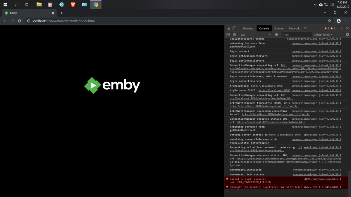 D0n 2 Posted December 1, 2019 Author Posted December 1, 2019 I closed the tray icon and it ended the embytray.exe process. I ran as admin. EmbyServer.exe in C:\Users\Don\AppData\Roaming\MediaBrowser-Server\system It launched emby splash screen in Chrome and the embytray.exe restarted. Same errors in chrome console.