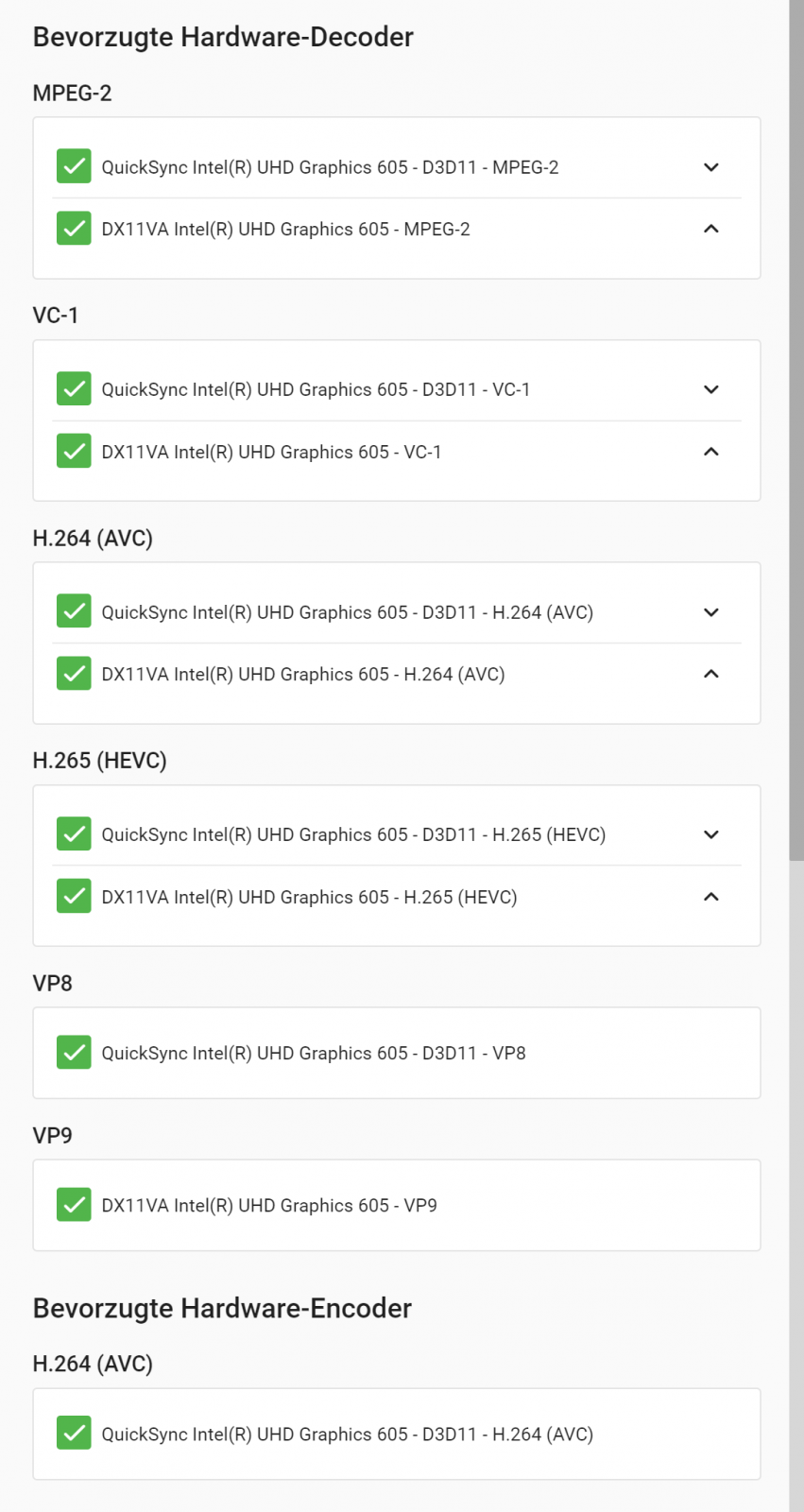 bi0h4zard 3 Posted December 12, 2019 Author Posted December 12, 2019 today i only can choose (i did not do anything since yesterday) Bevorzugte Hardware-Encoder H.264 (AVC)QuickSync Intel® UHD Graphics 605 - D3D11 - H.264 (AVC) and transcoding works with h.264 h.265 do not work