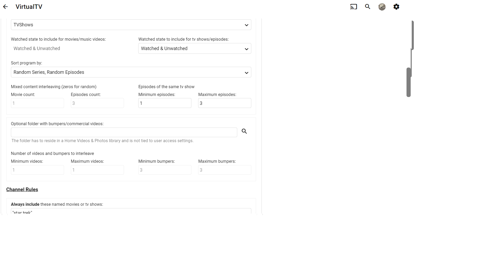 TZTZoro 26 Posted January 7, 2024 Posted January 7, 2024 I suppose that i found the poblem 2024-01-07 23:47:37.493 Debug VirtualTV: TVService > GetPrograms, Channel: BlissTV, ChannelId: VirtualTV-b059e3819c394182b45fb7134d7b53d5, Start Date: 07/01/2024 22:47:37 +01:00, End Date: 08/01/2024 22:47:37 +01:00, Querying Library for MixedContent Items 2024-01-07 23:47:37.493 Debug VirtualTV: TVService > GetMovies, Returning Movies based on Rules 2024-01-07 23:47:37.880 Info VirtualTV: TVService > GetLibraryItems, No Movie Items match the Channel Conditions 2024-01-07 23:47:37.880 Debug VirtualTV: TVService > GetEpisodes, Returning TVShows based on Rules 2024-01-07 23:47:38.563 Info VirtualTV: TVService > GetLibraryItems, No Episode Items match the Channel Conditions 2024-01-07 23:47:38.563 Info VirtualTV: TVService > GetLibraryItems, No MixedContent Items match the Channel Conditions 2024-01-07 23:47:38.563 Debug VirtualTV: TVService > GetPrograms, Channel: BlissTV, ChannelId: VirtualTV-b059e3819c394182b45fb7134d7b53d5, Returning 0 MixedContent Items the musicvideos i got working, i have no clue what i really did