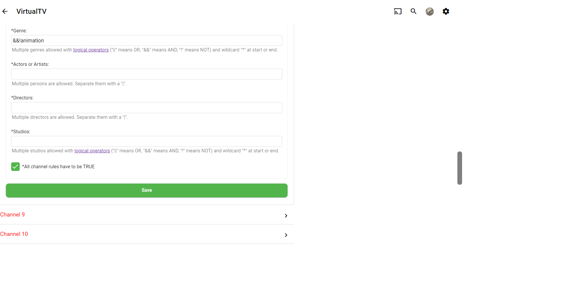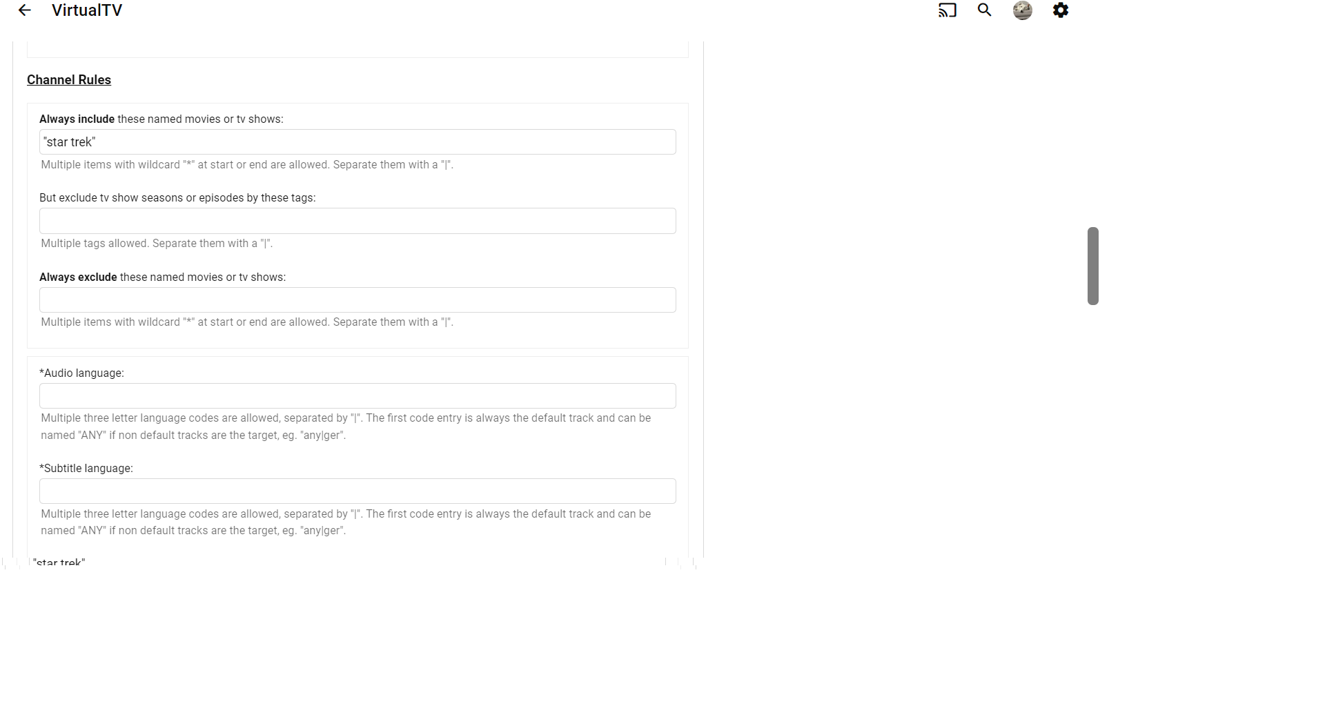 pünktchen 1409 Posted January 4, 2024 Author Posted January 4, 2024 38 minutes ago, JuJuJurassic said: I'm having a similar problem, I've disabled the TV channels, but the Sci-Fi ones are still there, the Christmas ones have gone. Why some and not all? I can't tell you without a log. 39 minutes ago, JuJuJurassic said: I'm also having problems creating a star trek channel. I've asked it not to show animation, but it's pulling any show, not just Star Trek. I've attached the screenshots. I tried entering star Trek instead of "star trek" but it didn't work. Always Include: Star Trek (without quotes) Genre: !Animation (without && before it)