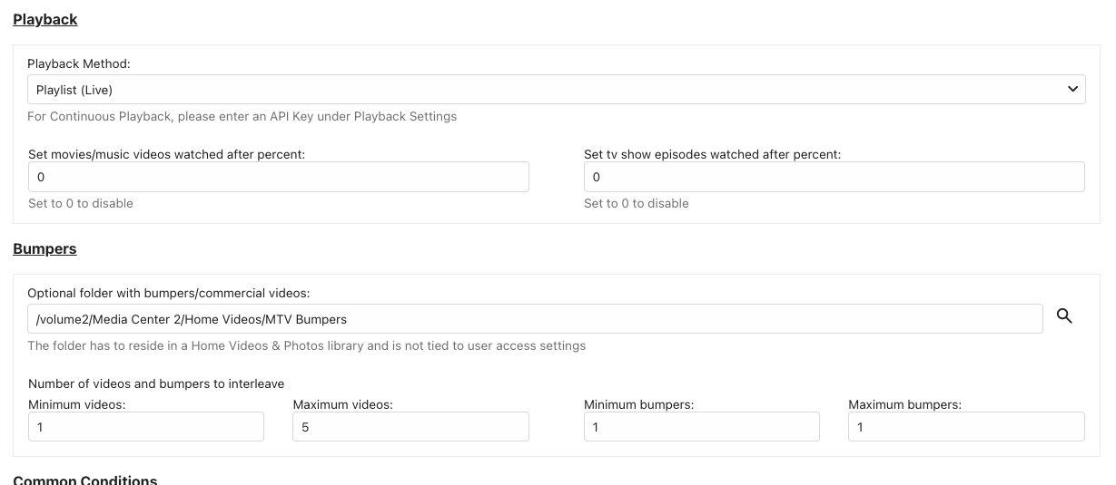 petera209 0 Posted August 1, 2024 Posted August 1, 2024 (edited) Firstly, I want to say that this plugin is amazing and has completely changed how I watch TV. Everyone I know is envious of our homemade "cable tv". So, thank you so much for the hard work. I have a quick question about Bumpers. I have tried to add them in to a couple of my channels but they don't ever seem to appear. I created a channel of all old music videos and have a folder full of random MTV promos to give it the feel of old MTV. I took a screenshot of my bumper settings. Can you tell me if I am doing something wrong. Thank you in advance for your help! Edited August 1, 2024 by petera209