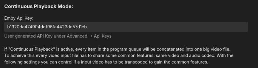 mrtj18 4 Posted December 15, 2024 Posted December 15, 2024 Quote Why do you want to use "Continuous Playback"? Anyway, i would need a new log with the plugins debug logging enabled after you have fixed the errors from your second question. Right now your log file is to big to find any useful information. Also please attach any ffmpeg or virtualtv log files that correspond to the time of your streaming errors I only selected that, because I thought its the default and best to use. What playback method should I select? Quote You are missing the "Token" parameter! You get a token from the authentication info of the plugins export settings. I created one, and placed it in the following place. Yet I continue to see the same error in the logs as well... Am I missing something here? embyserver(3).txt