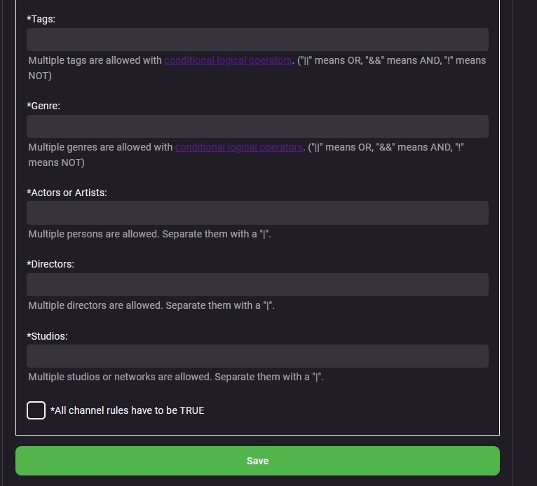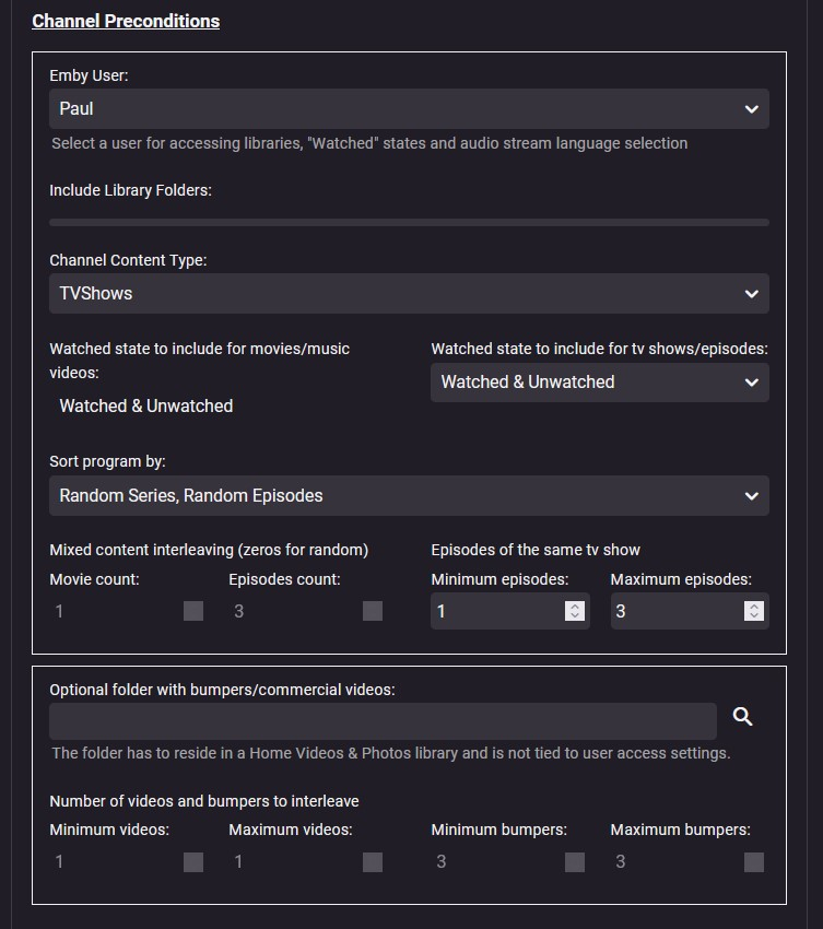 jordy 284 Posted July 17, 2023 Posted July 17, 2023 Hi, Just trying to get this plugin to work on my Windows 11 machine running EmbyServer Beta 4.8.0.39 I cannot get a channel to populate. I'm not sure but it may be that I don't see any library folders in the "Channel Preconditions" section. Can you please advise what if anything I need to change to make it work Debugging Does not show any errors - just says...: 2023-07-17 13:20:43.733 Info VirtualTV: TVService > GetPrograms: Channel: Paul's TV, ChannelId: VirtualTV0, Querying Library for TVShows 2023-07-17 13:20:43.758 Info VirtualTV: TVService > GetLibraryItems: No TVShow Items match the Channel Conditions 2023-07-17 13:20:43.758 Info VirtualTV: TVService > GetPrograms: Channel: Paul's TV, ChannelId: VirtualTV0, Returning 0 TVShows 2023-07-17 13:20:43.758 Debug LiveTvManager: Channel Paul's TV has 0 programs