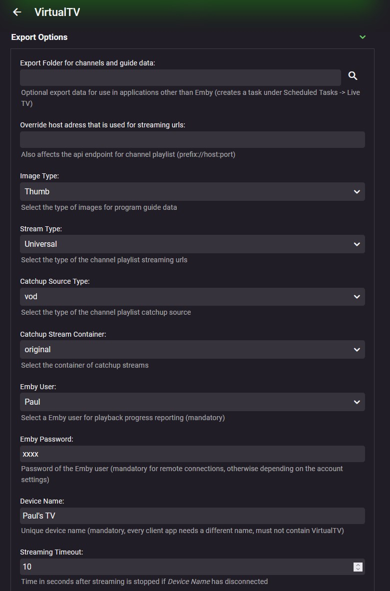 pünktchen 1409 Posted May 8, 2023 Author Posted May 8, 2023 C'mon, that are nearly all options. Are you kidding me? Stream type: EmbyCon and EmbyNextGen is for Kodi only Catchup source type: If you don't know what it is, then it's of no interest for you Emby user and password: Should be self explanatory. It's used for playback progress reporting Device name: VLC, Tivimate or whatever. A device with this name is created in Emby's device list. The Emby user has to be granted to use this device. Token: Just some additional custom security string (password like) to protect the web api endpoints