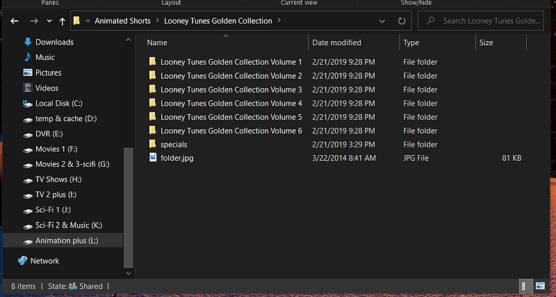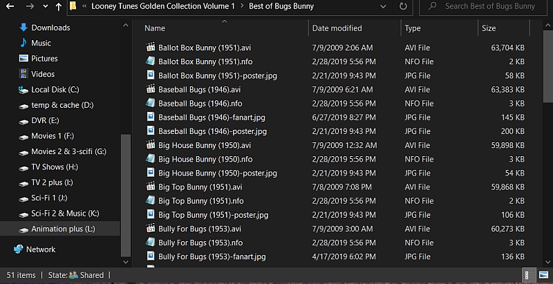 Deathsquirrel 745 Posted January 1, 2020 Posted January 1, 2020 You have two options that include metadata. You can either set them up as TV or movies. Both work but I greatly prefer the TV approach as it's easier to manage. Standard naming rules apply so just match the naming of your metadata provider. Here are examples of each. Movie Example: \\<SERVER>\<SHARE>\Movies\Katnip Kollege (1938)\Katnip Kollege (1938).mkv \\<SERVER>\<SHARE>\Movies\Tortoise Wins By A Hare (1943)\Tortoise Wins By A Hare (1943).mkv TV Example: \\<SERVER>\<SHARE>\TV\Looney Tunes\Season 1938\Looney Tunes S1938E17 Katnip Kollege.mkv \\<SERVER>\<SHARE>\TV\Looney Tunes\Season 1943\Looney Tunes S1943E04 Tortoise Wins By A Hare.mkv If you use the movie approach you're going to need to build a BIG collection to hold them. The movie posters that you get also tend to be a mess. I prefer the TV approach as it's a lot less work. Sure, the season naming is silly, but you generally shuffle these anyway so you don't browse a lot.