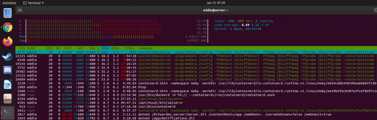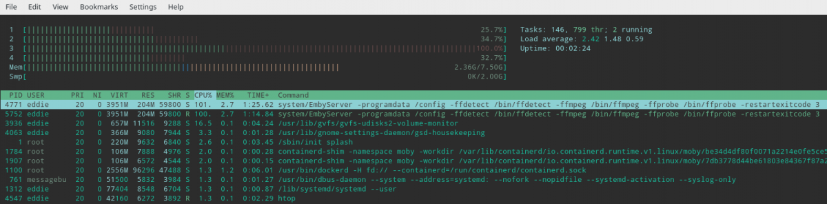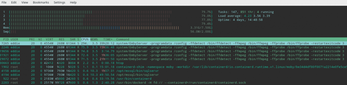 Eddie 12 Posted January 12, 2020 Posted January 12, 2020 (edited) Hello im running Kubuntu 18.04 Emby was running real quiet on my server with barely any CPU load even when people were using it I recently upgrade to 4.3.1.0 and now im noticing a process run at nearly or close to 100% and i wanted to know what it is system/embyserver -programdata /config -ffdetect /bin/ffdetec -ffmpeg /bin/ffmpeg -ffprobe /bin/ffprobe -restartexitcode3 I attached 2 pictures one with a long uptime and the other after a fresh update and restart and letting it sit for a few minutes without anyone logged in Thanks in Advance Edited January 15, 2020 by Eddie