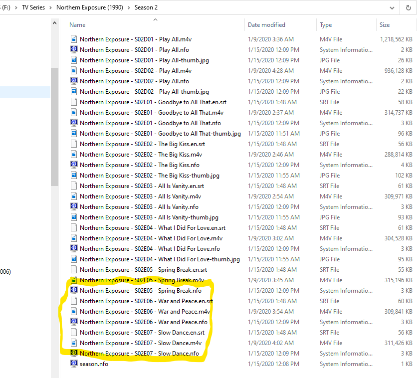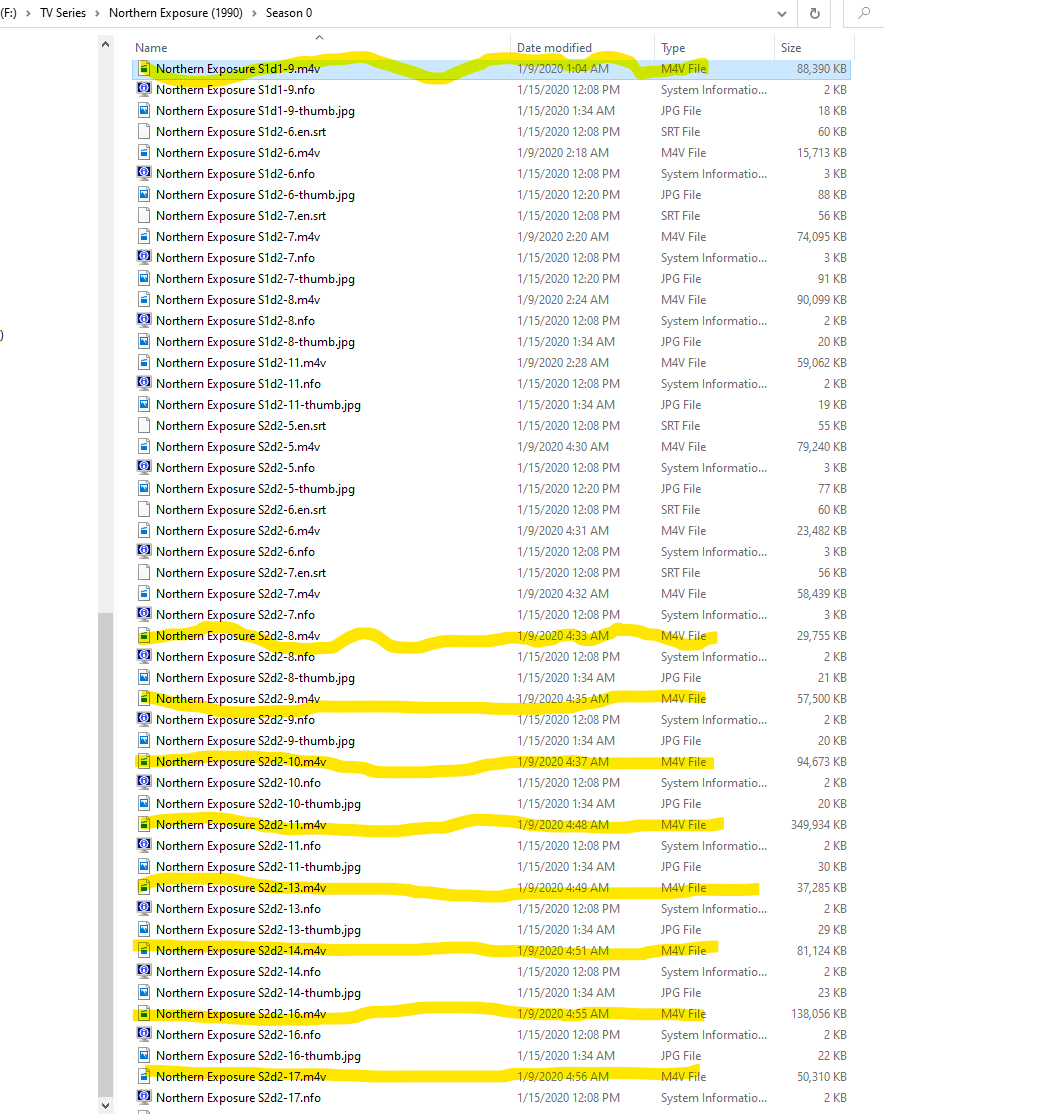 rckrchrdsn 0 Posted January 15, 2020 Posted January 15, 2020 (edited) Emby Server, Windows, 4.3.1.0. Using Webviewer, latest updates of Android App and Windows 10 App for viewing. The display is the same for all three viewers. I recently uploaded all seasons of Northern Exposure using naming convention of "show name - SxxExx - episode name". I include pictures of the file system on the server drive and a picture of the directory where I noticed the incorrect outcome. In the viewers I get my "show name - SxxDxx - Play All" files at the top of the list. I then get a properly enumerated episode with Emby's episode description from episode 1 to 4. Episode 5 through 7 are not displayed but the short list of proper episodes is followed by season 2 extras out of the Season 0 directory, though the list season 0 extras is not complete is not complete showing about 9 extras out of 13. All the episodes are shown in the picture below with a yellow rectangle around the episodes not shown. I show third image of the Season 0 subdir with the video files that show up in the Season 2 viewers lists marked in yellow, so I see two play all, 4 episodes, and 8 files from Season 0. I could live with the Season 0 since they are not listed as episodes, I attach a sample of what Emby Theater shows. Note, that the number 5 to 7 are not used, and the season 0 additions start at 8. Here's hoping you see something obvious and easy to fix! Edited January 15, 2020 by rckrchrdsn