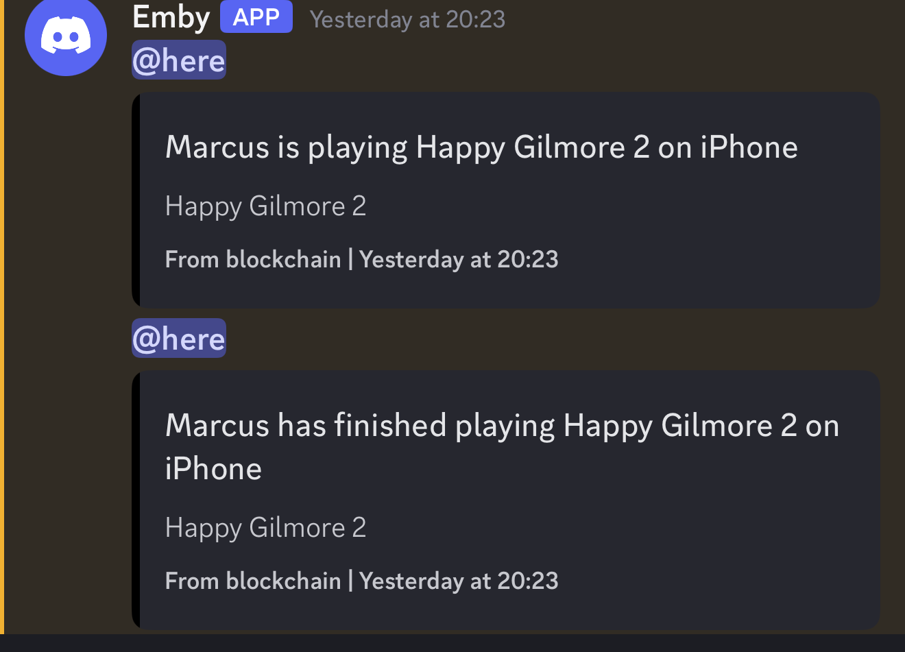 Luke 42077 Posted December 26, 2024 Posted December 26, 2024 9 hours ago, Mac18 said: For the record also, I just now tried to. uninstall discord plugin restart the server install discord plugin restart the server and immediately i received a notification from discord "the server has been restarted" without any configured notification, is there any way to manually delete the old configured notification that the emby does not detected? if there is, can you give me the path of notification config so i can delete the folder or files. and reconfigure again None of those actions will clear existing saved configurations, just FYI.