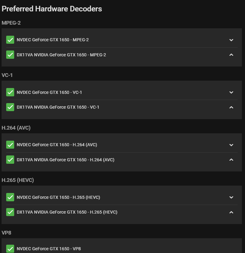 MisterAngelus 7 Posted February 14, 2020 Posted February 14, 2020 I got a new video card GTX 1650 and i'm trying hardware transcoding and no matter what i do it seems to use the cpu these files have no subtitles so i thought it would use the GTX and not the cpu here are my settings
