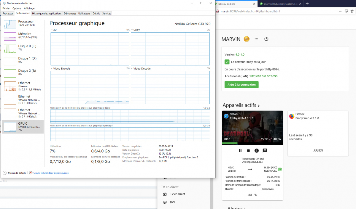 Yul37 0 Posted March 3, 2020 Posted March 3, 2020 (edited) Hi, I've recently upgraded to Premiere to be able to use hardware acceleration but I have issue with transcoding : The CPU is still used at 100%, whereas the GPU is used at 9% only. Is there something I could do to improve this and free some CPU ? Thank you. embyserver.txt Edited March 3, 2020 by Yul37