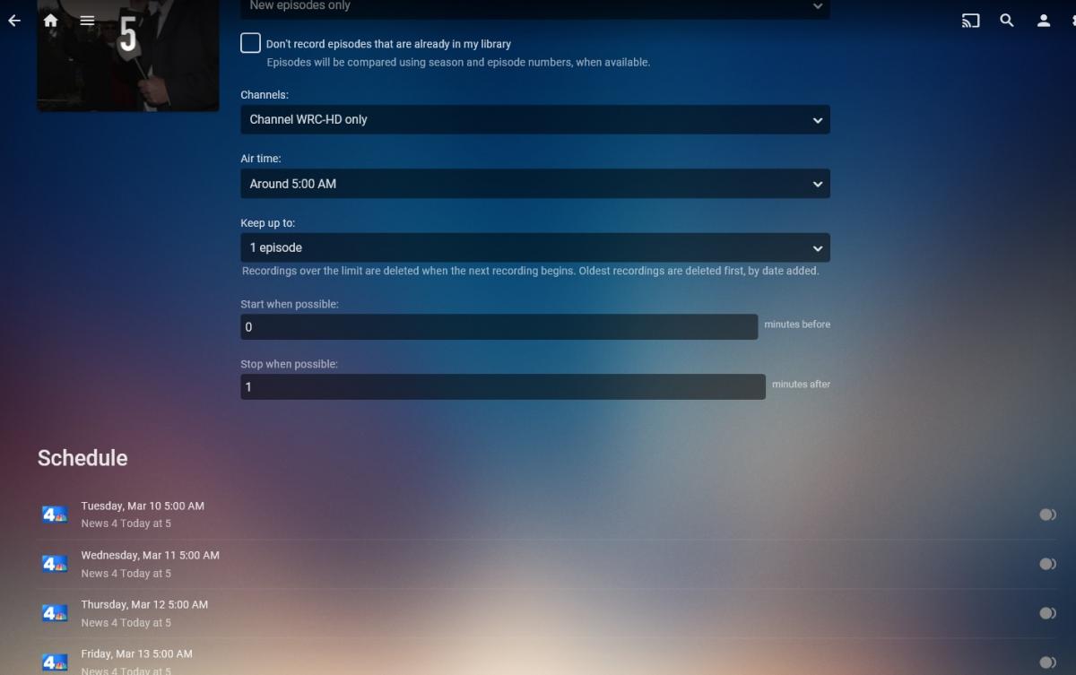 MBSki 1114 Posted March 9, 2020 Posted March 9, 2020 This is really odd, but the recordings were working fine until Daylight Savings Time hit. Now none of the episodes of News 4 morning news is recording when it's set to record "around 5 AM". If I set it to Anytime, it'll record. The show starts at exactly 5 AM, so no idea why it wouldn't record with those settings. The screen shot shows the recording set to "Around 5 AM" and no episodes set to record.