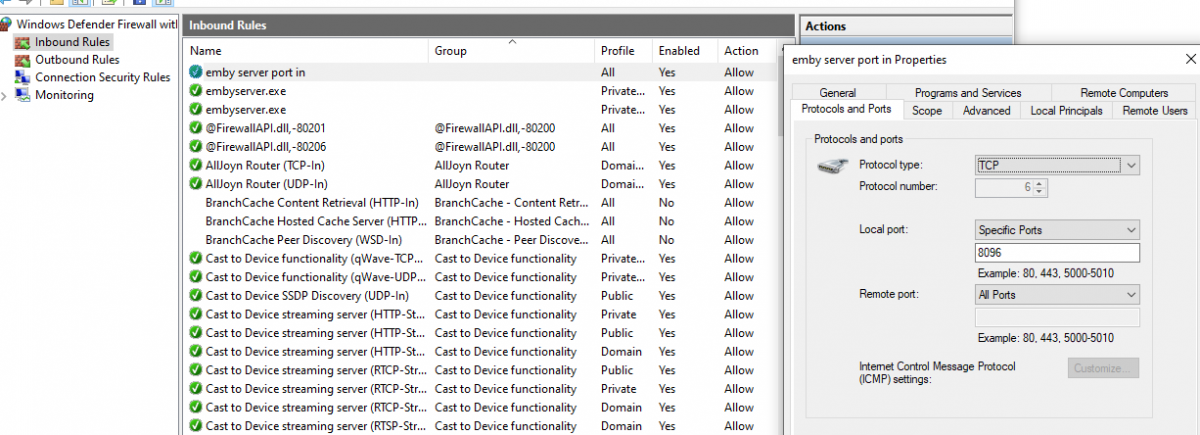 joolsclop 1 Posted March 19, 2020 Author Posted March 19, 2020 (edited) "I opened 8096 port on the server firewall." Can you share the rule as I suspect (as Happy2Play says) your Inbound firewall rule is possibly incorrect (Outbound is usually not restricted anyway) and/or and on the wrong 'profile' because emby works on the local machine. It's also worth disabling the Port Mapper plugin, but check the firewall rule first. Thanks for your assistance. Firewall rule image attached. Still no joy, have tried everything I know .nothing connects. I noticed on the server under Users there is nothing and the roundal keeps spinning forever? Edited March 19, 2020 by joolsclop