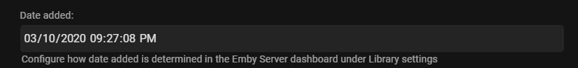 embyzone 5 Posted March 31, 2020 Author Posted March 31, 2020 (edited) Yes and the nfo is created by Emby! <dateadded>2020-03-10 20:27:08</dateadded> But why is Emby creating a date in the past? I checked the lof files on Emby and the date is correct? This is so strange.... UPDATE: Emby takes the creation of the file and not the date I am adding the file or the date of the NFO creation....? Edited March 31, 2020 by embyzone