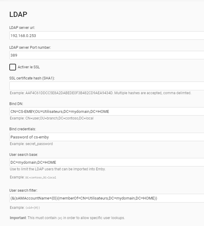 Daphra 0 Posted March 31, 2020 Author Posted March 31, 2020 Hi, When i try this, nothing. I cannot authenticate on the portal emby. I just see the local user to connect, i try by manual connexion, and the message is connection error. So, did the Bind DN: is an service account to browsed the LDAP? How to connect LDAP user in the interface? Sorry for the screenshot, it"s french!!! Thank U to help me.