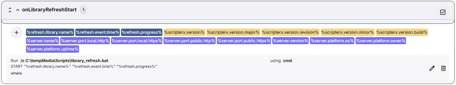 Anthony Musgrove 220 Posted March 29, 2025 Author Posted March 29, 2025 (edited) Hi Victor! Thank you for your question - New Functionality/Feature Please update to version 6.0.0.4 (latest on catalog). I've introduced three new Events: These events will trigger when your library is refreshed - which includes adding new items, removing items, etc. I will also have a way to output the items affected in the next release. Script example (library_refresh.bat REM Parameters expected: start|end|progressupdate "%refresh.library.name%" "%refresh.event.time%" "%refresh.progress%" @echo Library Refresh [%1] (Library: %2) (Event Time: %3) (Progress: %4) >> C:\tempMedia\Scripts\libraryrefresh.log Log yielded (libraryrefresh.log # libraryrefresh log Library Refresh [START] (Library: "TV") (Event Time: "3/30/2025 8:09:38 AM") (Progress: "0") Library Refresh [PROGRESS] (Library: "TV") (Event Time: "3/30/2025 8:09:38 AM") (Progress: "5") Library Refresh [PROGRESS] (Library: "TV") (Event Time: "3/30/2025 8:09:38 AM") (Progress: "10") Library Refresh [START] (Library: "Shifting Gears") (Event Time: "3/30/2025 8:09:38 AM") (Progress: "0") Library Refresh [PROGRESS] (Library: "TV") (Event Time: "3/30/2025 8:09:38 AM") (Progress: "14") Library Refresh [PROGRESS] (Library: "Shifting Gears") (Event Time: "3/30/2025 8:09:38 AM") (Progress: "5") Library Refresh [PROGRESS] (Library: "TV") (Event Time: "3/30/2025 8:09:38 AM") (Progress: "18") Library Refresh [PROGRESS] (Library: "Shifting Gears") (Event Time: "3/30/2025 8:09:38 AM") (Progress: "10") Library Refresh [PROGRESS] (Library: "Season 1") (Event Time: "3/30/2025 8:09:38 AM") (Progress: "5") Library Refresh [START] (Library: "Season 1") (Event Time: "3/30/2025 8:09:38 AM") (Progress: "0") Library Refresh [PROGRESS] (Library: "Shifting Gears") (Event Time: "3/30/2025 8:09:38 AM") (Progress: "14") Library Refresh [START] (Library: "Jimmy") (Event Time: "3/30/2025 8:09:38 AM") (Progress: "0") Library Refresh [PROGRESS] (Library: "Shifting Gears") (Event Time: "3/30/2025 8:09:38 AM") (Progress: "19.06666666666667") Library Refresh [PROGRESS] (Library: "Shifting Gears") (Event Time: "3/30/2025 8:09:38 AM") (Progress: "20.133333333333333") Library Refresh [PROGRESS] (Library: "Shifting Gears") (Event Time: "3/30/2025 8:09:38 AM") (Progress: "18") Library Refresh [PROGRESS] (Library: "Season 1") (Event Time: "3/30/2025 8:09:38 AM") (Progress: "10") Library Refresh [PROGRESS] (Library: "TV") (Event Time: "3/30/2025 8:09:38 AM") (Progress: "25.253333333333337") Library Refresh [PROGRESS] (Library: "TV") (Event Time: "3/30/2025 8:09:39 AM") (Progress: "41.46666666666667") Library Refresh [START] (Library: "Picnic") (Event Time: "3/30/2025 8:09:39 AM") (Progress: "0") Library Refresh [PROGRESS] (Library: "TV") (Event Time: "3/30/2025 8:09:38 AM") (Progress: "21.200000000000003") Library Refresh [PROGRESS] (Library: "TV") (Event Time: "3/30/2025 8:09:38 AM") (Progress: "24.4") Library Refresh [END] (Library: "Picnic") (Event Time: "3/30/2025 8:09:39 AM") (Progress: "100") Library Refresh [PROGRESS] (Library: "Jimmy") (Event Time: "3/30/2025 8:09:38 AM") (Progress: "5") Library Refresh [PROGRESS] (Library: "Picnic") (Event Time: "3/30/2025 8:09:39 AM") (Progress: "5") Library Refresh [PROGRESS] (Library: "Season 1") (Event Time: "3/30/2025 8:09:39 AM") (Progress: "63.33333333333333") Library Refresh [PROGRESS] (Library: "Shifting Gears") (Event Time: "3/30/2025 8:09:39 AM") (Progress: "60.666666666666664") Library Refresh [PROGRESS] (Library: "Season 1") (Event Time: "3/30/2025 8:09:39 AM") (Progress: "64.66666666666666") Library Refresh [PROGRESS] (Library: "Shifting Gears") (Event Time: "3/30/2025 8:09:39 AM") (Progress: "61.73333333333333") Library Refresh [PROGRESS] (Library: "Season 1") (Event Time: "3/30/2025 8:09:39 AM") (Progress: "38") Library Refresh [PROGRESS] (Library: "Season 1") (Event Time: "3/30/2025 8:09:39 AM") (Progress: "39.33333333333333") Library Refresh [PROGRESS] (Library: "Shifting Gears") (Event Time: "3/30/2025 8:09:39 AM") (Progress: "41.46666666666667") Library Refresh [PROGRESS] (Library: "TV") (Event Time: "3/30/2025 8:09:39 AM") (Progress: "58.53333333333333") Library Refresh [PROGRESS] (Library: "Shifting Gears") (Event Time: "3/30/2025 8:09:39 AM") (Progress: "40.400000000000006") Library Refresh [PROGRESS] (Library: "TV") (Event Time: "3/30/2025 8:09:40 AM") (Progress: "90") Library Refresh [START] (Library: "Career") (Event Time: "3/30/2025 8:09:39 AM") (Progress: "0") Library Refresh [PROGRESS] (Library: "TV") (Event Time: "3/30/2025 8:09:39 AM") (Progress: "60.24000000000001") Library Refresh [END] (Library: "Season 1") (Event Time: "3/30/2025 8:09:40 AM") (Progress: "100") Library Refresh [PROGRESS] (Library: "Shifting Gears") (Event Time: "3/30/2025 8:09:39 AM") (Progress: "62.800000000000004") Library Refresh [PROGRESS] (Library: "TV") (Event Time: "3/30/2025 8:09:40 AM") (Progress: "100") Library Refresh [PROGRESS] (Library: "Season 1") (Event Time: "3/30/2025 8:09:40 AM") (Progress: "90") Library Refresh [PROGRESS] (Library: "Shifting Gears") (Event Time: "3/30/2025 8:09:40 AM") (Progress: "90") Library Refresh [END] (Library: "Shifting Gears") (Event Time: "3/30/2025 8:09:40 AM") (Progress: "100") Library Refresh [PROGRESS] (Library: "TV") (Event Time: "3/30/2025 8:09:39 AM") (Progress: "43.17333333333334") Library Refresh [END] (Library: "TV") (Event Time: "3/30/2025 8:09:40 AM") (Progress: "100") Library Refresh [PROGRESS] (Library: "Career") (Event Time: "3/30/2025 8:09:39 AM") (Progress: "5") Library Refresh [PROGRESS] (Library: "TV") (Event Time: "3/30/2025 8:09:40 AM") (Progress: "100") Library Refresh [PROGRESS] (Library: "TV") (Event Time: "3/30/2025 8:09:40 AM") (Progress: "100") Library Refresh [PROGRESS] (Library: "TV") (Event Time: "3/30/2025 8:09:40 AM") (Progress: "93.33333333333333") Library Refresh [PROGRESS] (Library: "Movies") (Event Time: "3/30/2025 8:09:40 AM") (Progress: "10") Library Refresh [PROGRESS] (L