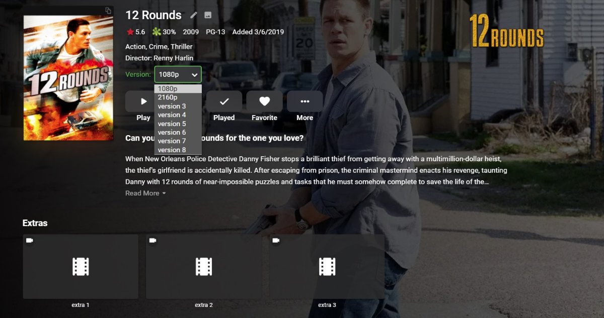 Happy2Play 9783 Posted March 5, 2021 Posted March 5, 2021 (edited) Okay there may be a issue as your folder name and file names actually does not conform to multi-version requirements. Sure the would with the plug but don't know about extras in this overall situation. @spon Multi-version movies Multiple versions of the same content can be stored in a single movie folder. /Movies /300 (2006) /300 (2006)/300 (2006) - 1080p.mkv /300 (2006)/300 (2006) - 1080p-trailer.mp4 /300 (2006)/300 (2006) - 4K.mkv /300 (2006)/300 (2006) - 720p.mp4 /300 (2006)/300 (2006) - extended edition.mp4 /300 (2006)/300 (2006) - directors cut.mp4 /300 (2006)/300 (2006) - 3D.hsbs.mp4 Each version must begin with the folder name, followed by " - ". Not sure this will work at all with your current naming scheme. Edited March 5, 2021 by Happy2Play