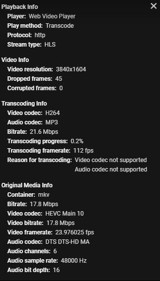 ebr 16195 Posted June 29, 2020 Posted June 29, 2020 Hi. Web browsers do not support the type of audio and video you are trying to play so the server is converting it for you. Transcoding