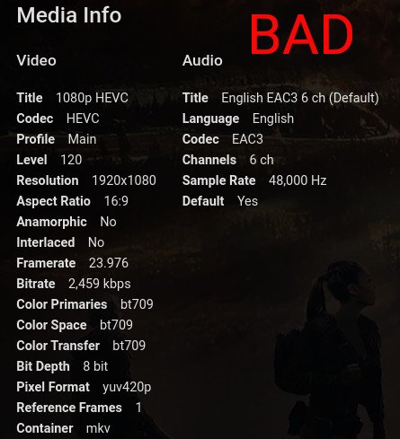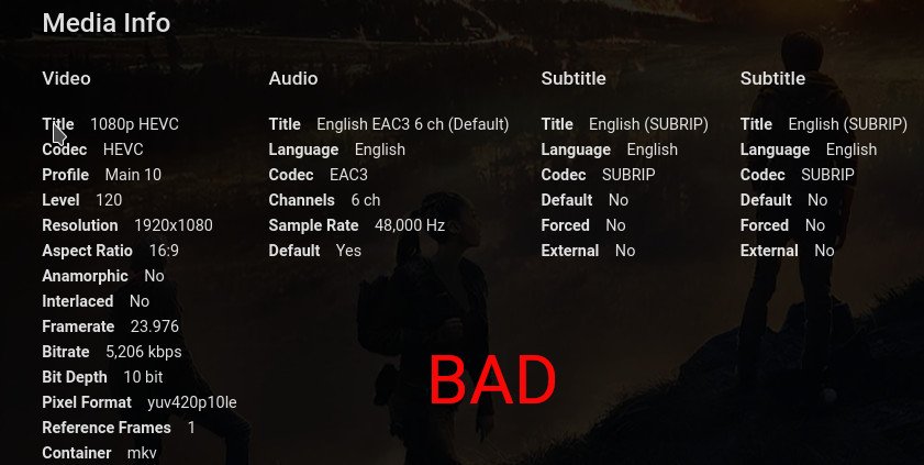 marktaff 14 Posted July 16, 2020 Author Posted July 16, 2020 Nothing seems off to me in the video/audio details. Everything is on the details page as expected, except for the two 'bad' episodes don't have a Director listed. Attached screenshots of the bad episodes a/v data and the good episodes that bracket them.