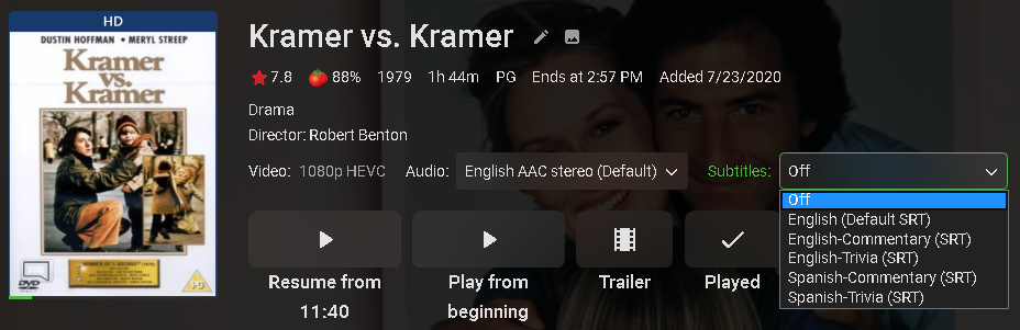 crusher11 1102 Posted July 25, 2020 Author Posted July 25, 2020 (edited) Weird. I thought I'd tried that, but it didn't work. It displayed fine, but Emby didn't recognise the language so they weren't selected automatically for foreign-language content. But it works now, so I must have been doing something slightly different. However, if I put for example "Movie (Year).en.English Commentary.srt", it displays as EnglishCommentary, removing the space. Why is this? EDIT: Actually I'm not sure it does work. Once I select a track, it stays selected. So that's interfering with my results. Okay, so basically I've been trying different suffixes and languages and fiddling with the language of the actual movie, but once the subtitle track becomes something that Emby selects automatically (which it did when I tried "en.default.srt" and changed the movie to Bengali), it stays selected no matter what I do after that, which in this case was changing it to en.English-Commentary.srt and changing the movie back to English. It shouldn't have subs now, but it does. I didn't play the movie at all, just went to its info page. Edited July 25, 2020 by crusher11