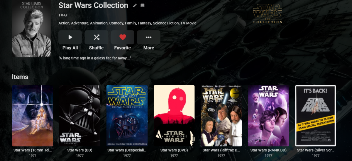 Happy2Play 9780 Posted August 14, 2020 Posted August 14, 2020 (edited) 3 minutes ago, Luke said: What are we looking at here? This is a collection. Are you confusing two different features? Multi-version grouping and collections are two different things. User wants ungrouped items to show within collection and Emby appears to regroup items after awhile, assume a full library scan. Quote I have nine versions of Star Wars in a folder, for each version, I've edited the title field in metadata, changed the poster art and added them to a collection. When I return later in the day to view the collection, only 3 versions are displayed. I click one version and choose Split Versions Apart, refresh the browser and it displays all nine. I've done this about 10 times since last night. I also can't seem to get the extras to stop showing in the main movies library, this doesn't happen with other movies, but, I assume, that may be a separate issue. Edited August 14, 2020 by Happy2Play