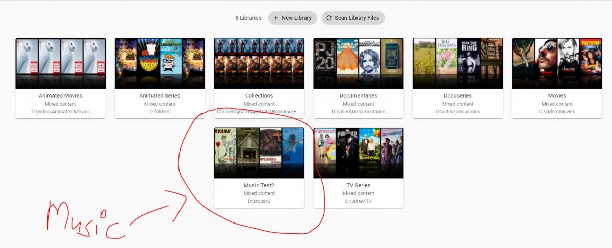 Happy2Play 9780 Posted August 24, 2020 Posted August 24, 2020 (edited) 3 hours ago, jbaggs said: how about this log file embyserver-63733796207.txt 198.21 kB · 2 downloads This log shows the music2 being processed, but look at the image. Music can not be Mixed Content. All of your libraries are Mixed content so my first question would be did you Restore your libraries? If so this is a bug in the 4.4.3.0 that has been resolved in the beta server. But you will have to redo all of your libraries do to this bug. There is a work around in another topic I can point you to but will still require rebuilding your database. Just like Collection library is broken also as it should be Collections content type auto generated by the server, but some libraries can be Mixed Content. Edited August 24, 2020 by Happy2Play 1