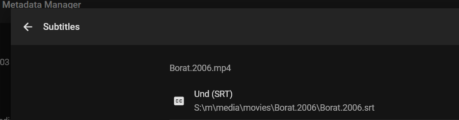 Carlo 4561 Posted August 26, 2020 Posted August 26, 2020 Could you humor me and try something? Change folder name to "Borat (2006)" Change both the movie and subtitle first part to ""Borat (2006)" as well. Open the srt file in notepad and make sure it has timing and text in it (ie looks semi valid). What happens now after doing library scan?