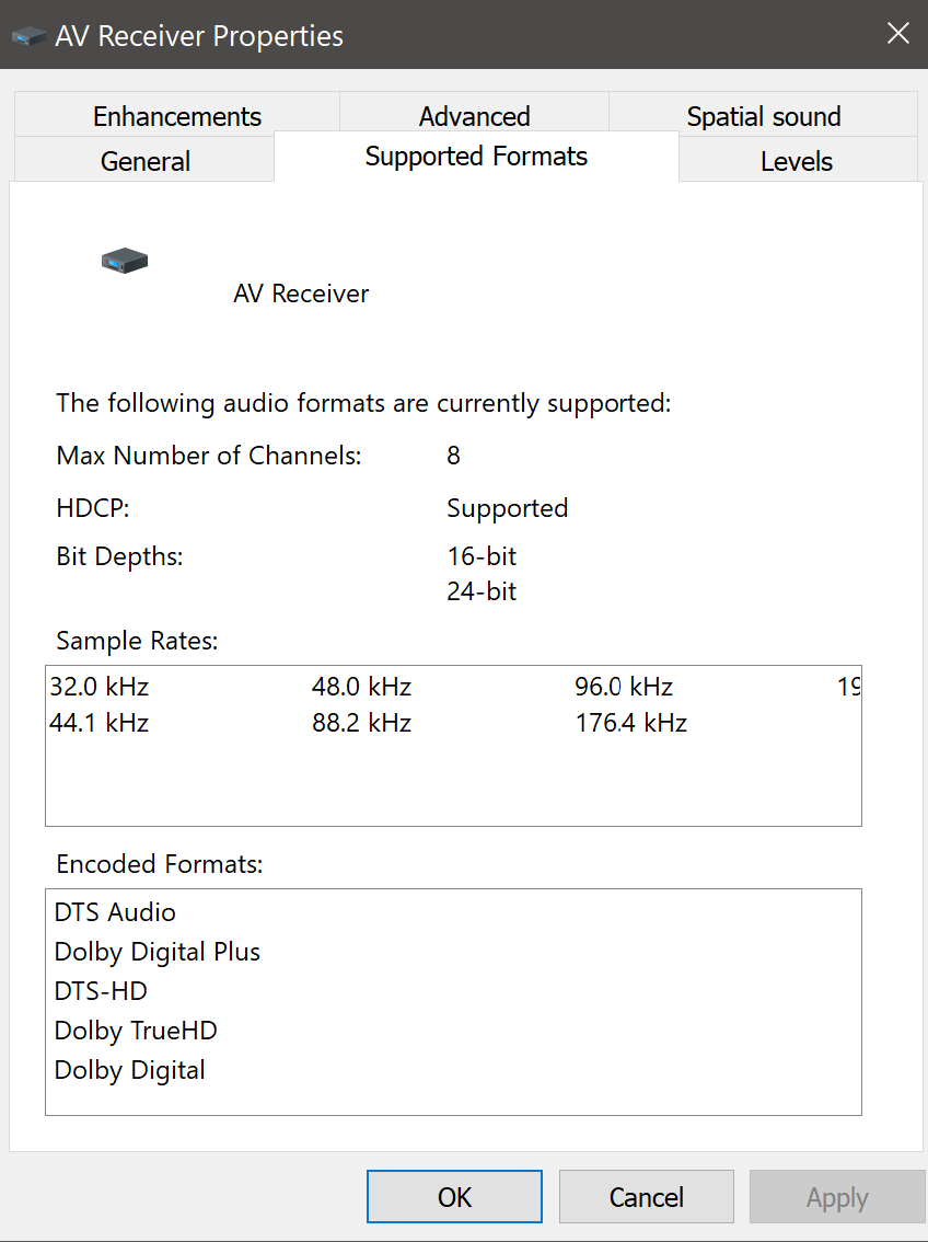 dmasterp 2 Posted August 31, 2020 Author Posted August 31, 2020 I was starting to think, this whole time it must be audio related. Last night when you had me make the audio adjustments, it seems to have fixed it. Not only have I not seen a spinning circle freeze. Videos seem to load just a split second faster than usual. To answer your question, I do not believe my receiver does Atmos, but honestly unsure. I never attempted to set it up. Just use my 5.1 setup I've had for years. Here is what Windows Audio shows: All of the Dolbys but no Atmos. However, I checked it on Amazon and it shows Supports 5.2.2-Channel Dolby Atmos and DTS:X playback or traditional 7.2 Channel surround sound Here is link on Amazon site if you want to review full product: https://www.amazon.com/gp/product/B06XTYXH9M/ref=ppx_yo_dt_b_search_asin_title?ie=UTF8&psc=1 I can say that I have not tried to set anything specific to Atmos. I actually even convert nearly all of my videos DTS, DTS-HD & DTS TrueHD tracks down to AC3 or EAC3 for better streaming to device ease. I do have some files with regular DTS but shouldn't have anything Atoms related.